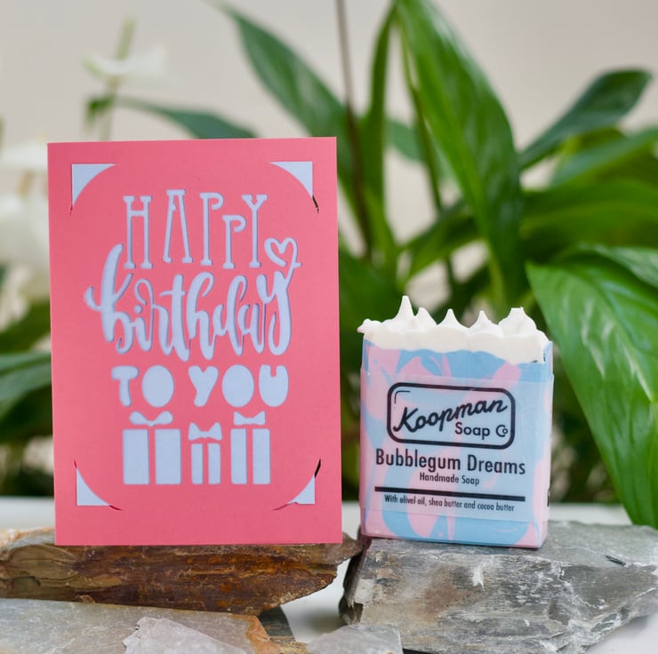 This beautiful eco friendly birthday gift consists of a handcrafted bubblegum scented soap and birthday card.