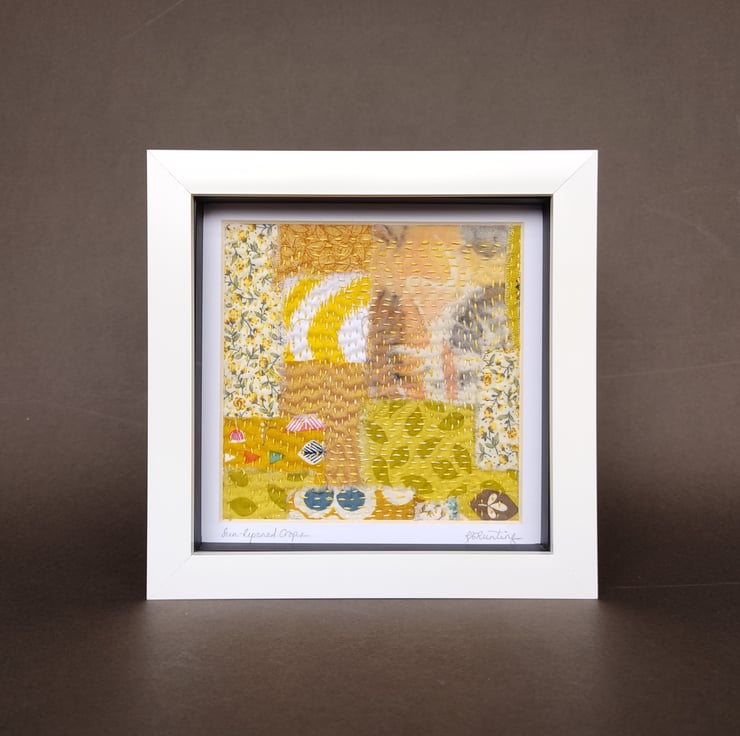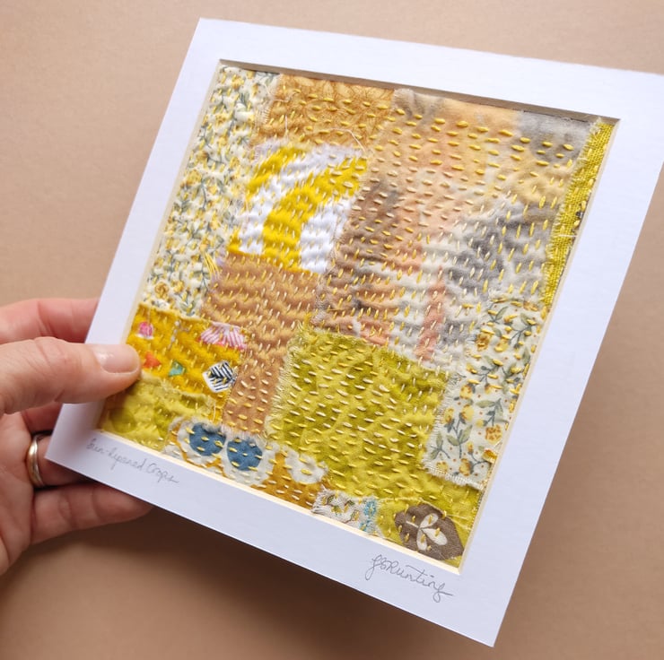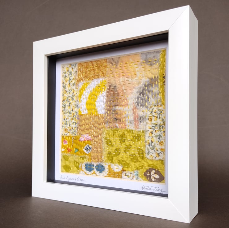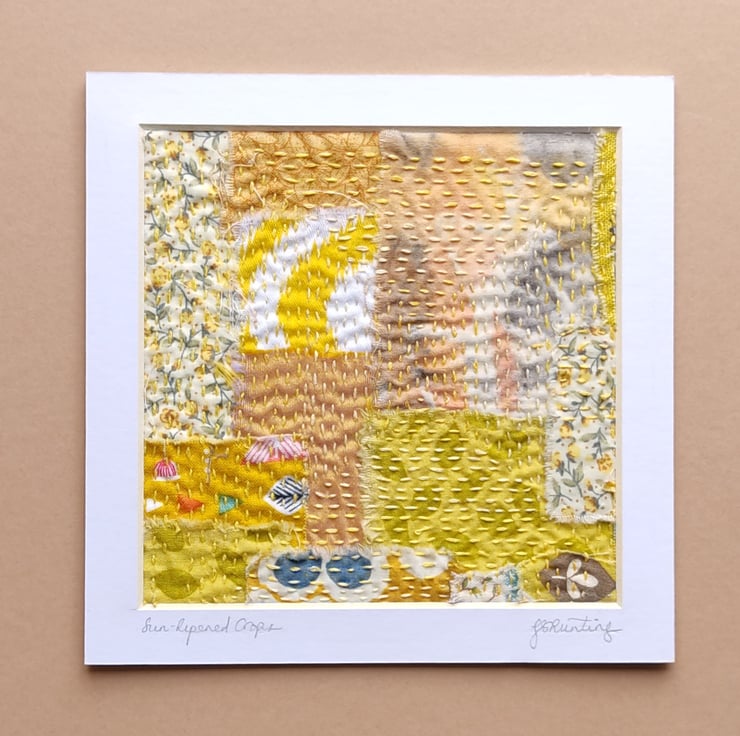 "Sun-Ripened Crops" is a unique textile artwork featuring hand embroidery. It has a warm colour palette and the gentle sheen of the embroidery threads reflects the gentle post-harvest light. It is a partner work to "Tell it to the Bees", also listed here in my shop.