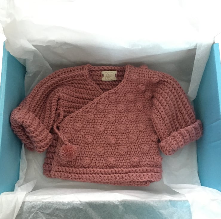 This practical, warm and cosy baby cardigan has been lovingly handmade with 100% acrylic super soft baby yarn