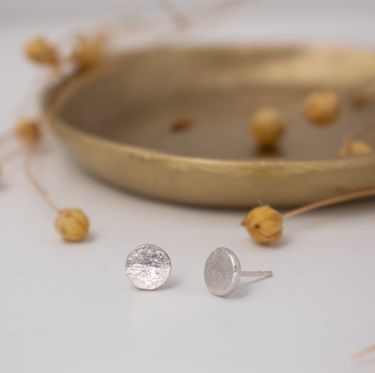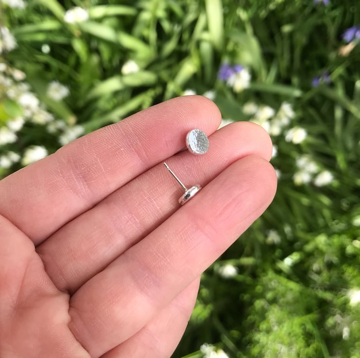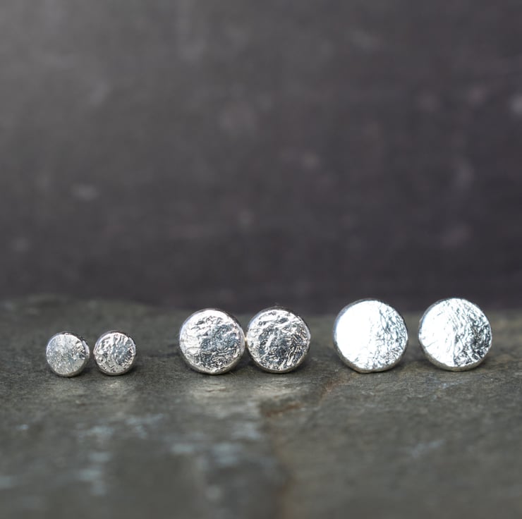 Silver stud earrings handmade using silver scraps that accumulate during the jewellery making process. Once collected, the off-cuts are melted down into silver droplets and hammered to produce the rustic textured surface. Recycled silver posts complete these zero-waste earrings.