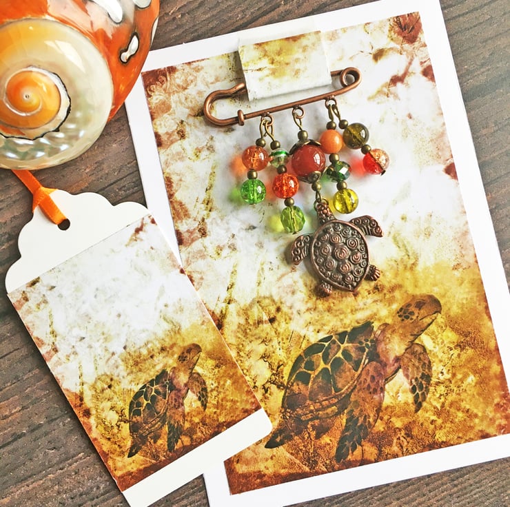 The pin measures about 5cm in length and the drop from the bottom bar of the pin to base of turtle is 6cm. I've presented it on a piece of stiff card decorated with a colour printout of a turtle. A matching gift tag is included.