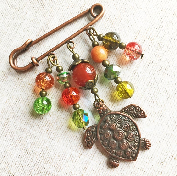 This pretty copper-tone kilt pin features a Greek Mykonos turtle charm nestled among a selection of glass and semi-precious beads including Carnelian, czech fire-polished, crackle glass and drawbench.