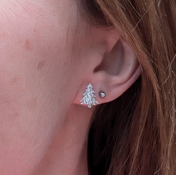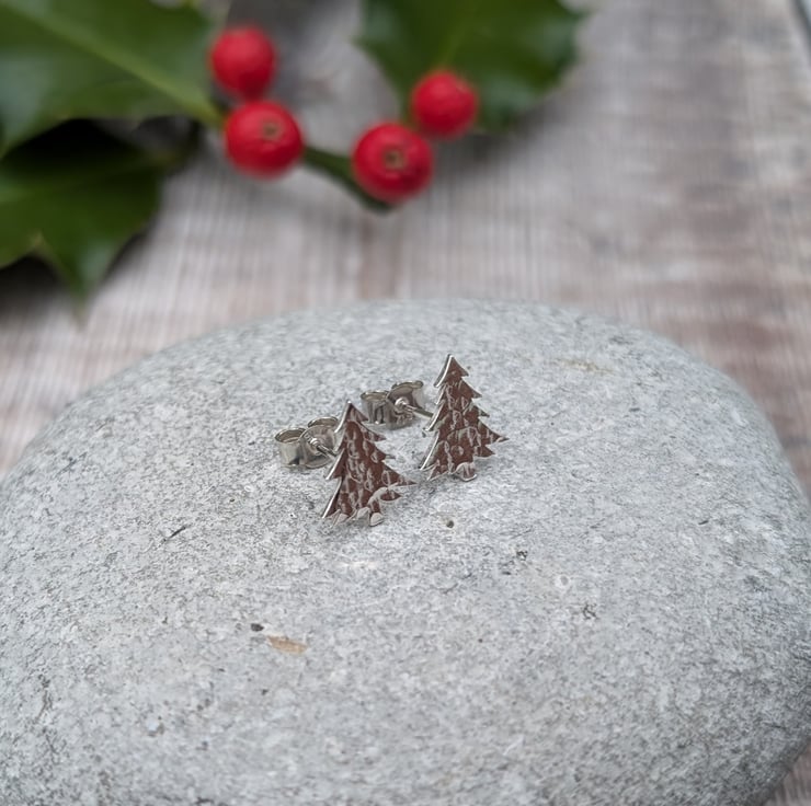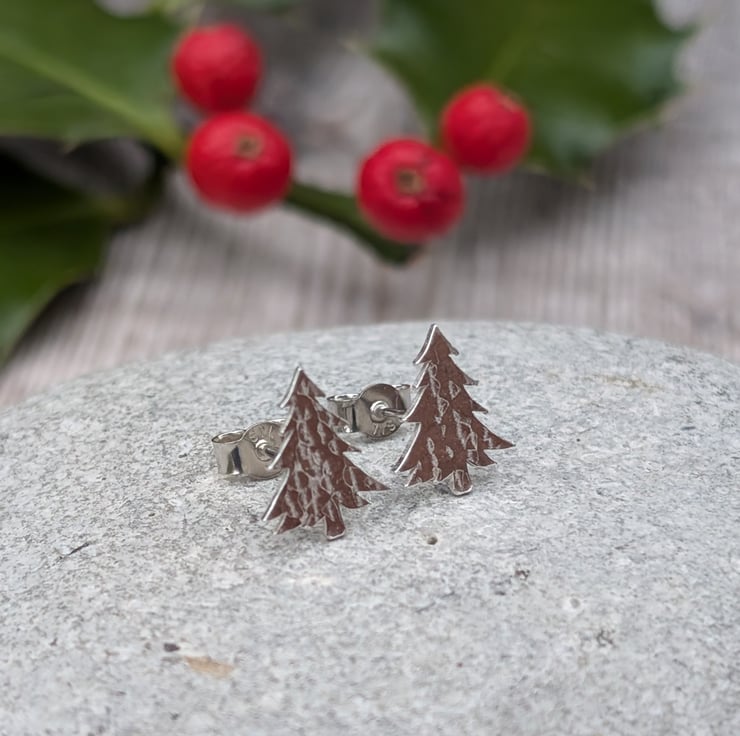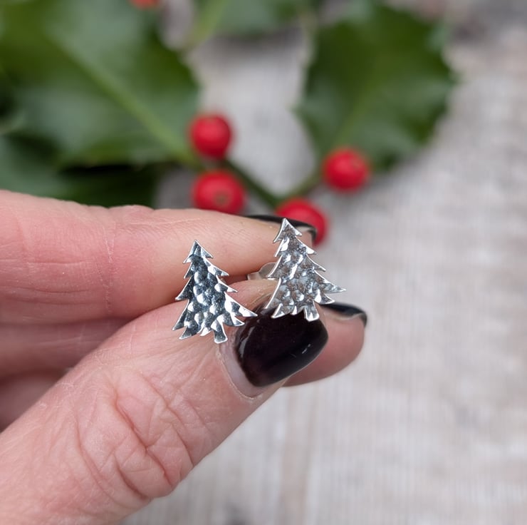 Gorgeous silver hammered Christmas tree stud earrings, hand made from recycled Sterling Silver using traditional silversmith techniques and given a polished finish.