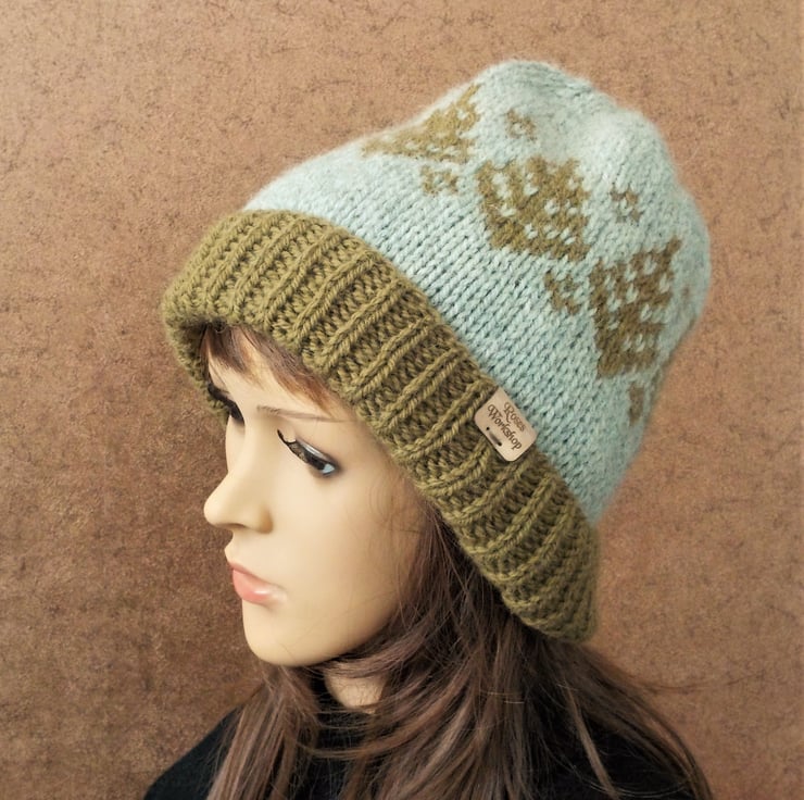 Hand knitted pure wool beanie hat with Fairisle trees pattern. Unisex design, suitable for men or women. The traditional Fairisle trees design is in moss green on a body of light grey, with a ribbed welt to keep your ears warm also in green. Or if you prefer you can wear it slouchy style with the welt turned down. The sweet little "Roses Workshop" brand label is laser etched faux leather.