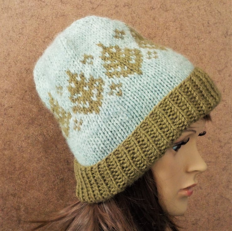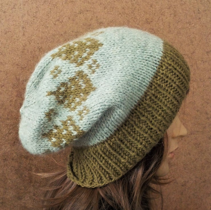 Hand knitted pure wool beanie hat with Fairisle trees pattern. Unisex design, suitable for men or women. The traditional Fairisle trees design is in moss green on a body of light grey, with a ribbed welt to keep your ears warm also in green. Or if you prefer you can wear it slouchy style with the welt turned down. The sweet little "Roses Workshop" brand label is laser etched faux leather.