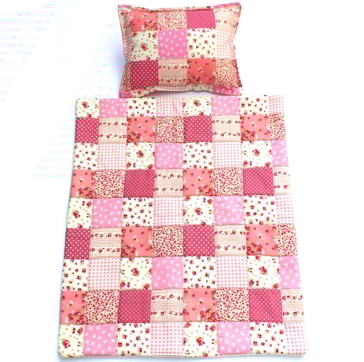 A beautiful doll's bedding set for a pram or cot comprising of: a pretty cotton patchwork quilt with a matching pillow.