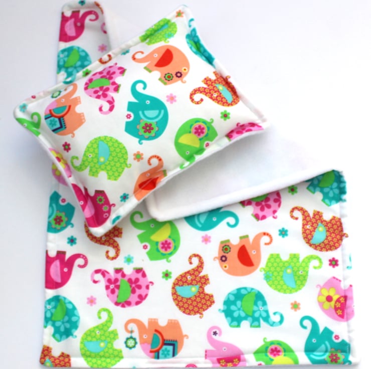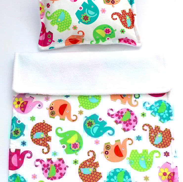 The blanket is made with a colourful 'Elephant' print cotton and soft cuddly white fleece on the reverse side. The pillow is filled with hollow fibre which conforms to the British safety standard.