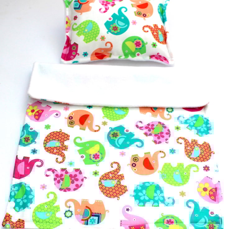 A pretty doll's bedding set for a pram or cot comprising of: a pretty cotton blanket with a matching pillow.