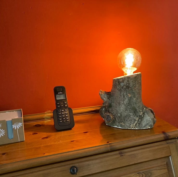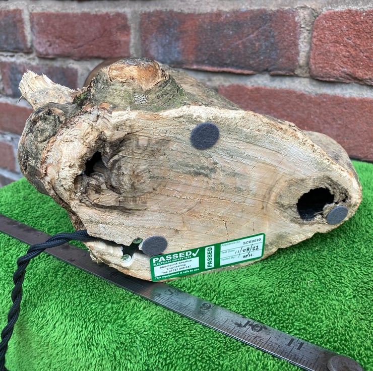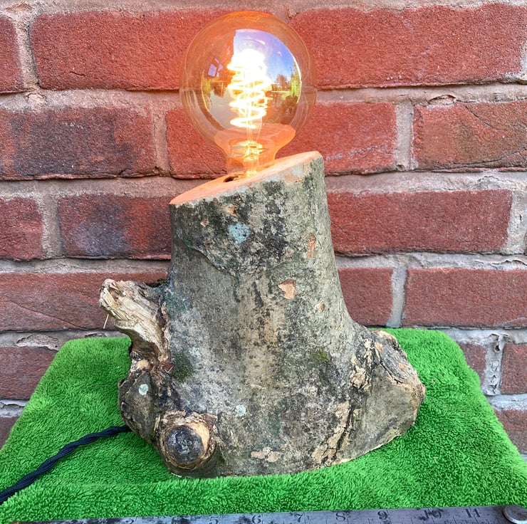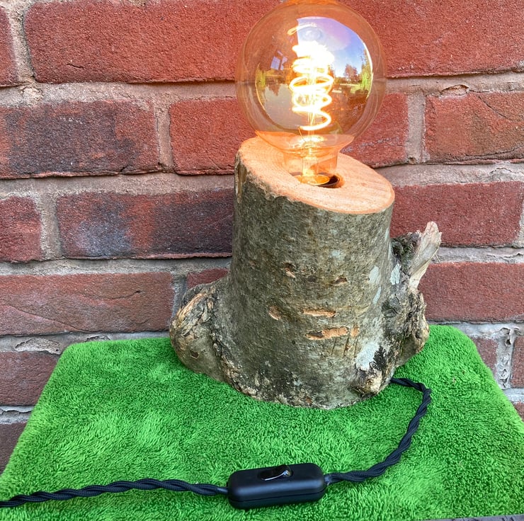 A kiln dried hardwood log, with smooth bark and interesting knots, some with holes, near the base. I have bored it out to conceal an E27 lampholder and fitted a decorative 5.5-Watt LED curly filament globe bulb which will gently light your space with a warm glow. Vintage look black twisted braided flex fitted with a black inline switch and a correctly 3 amp fused black British Standard plug complete the rustic countryside/farmhouse look.