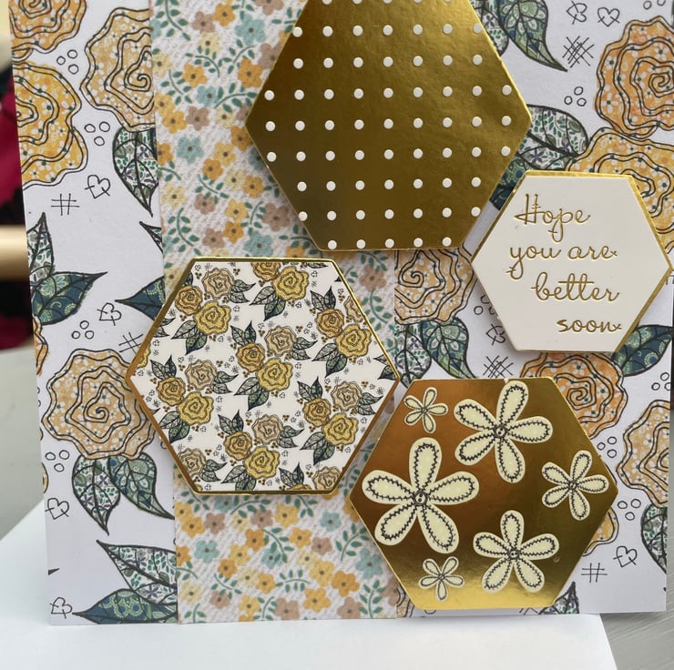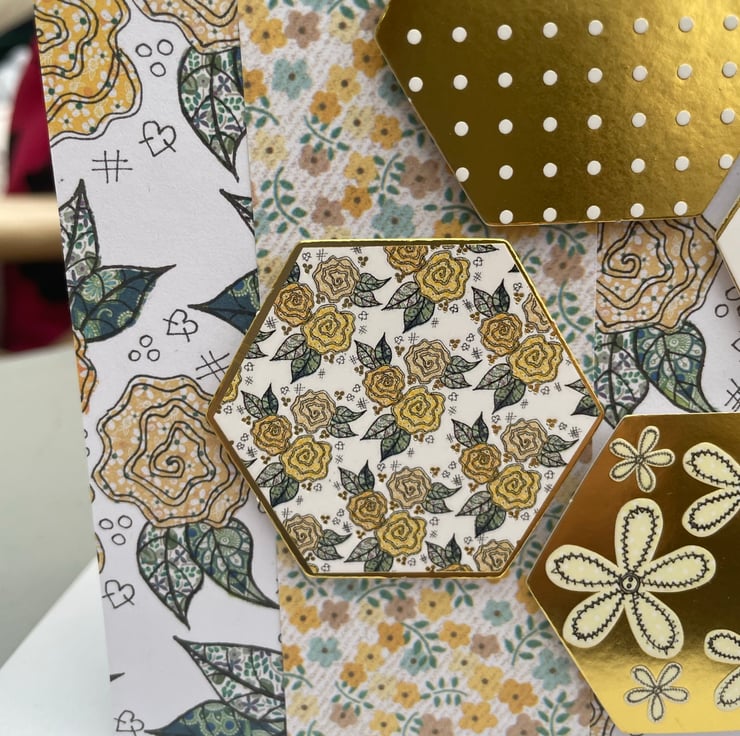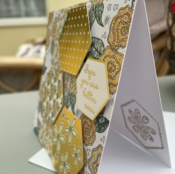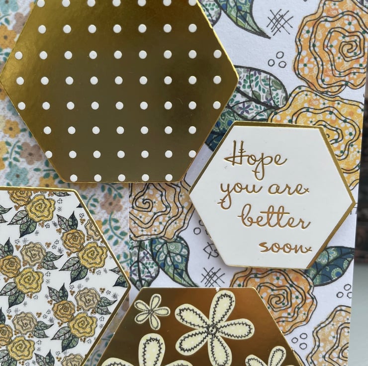 A beautiful patchwork style floral card to send to someone feeling under the weather. This 12x12cm card features a beautiful backimg paper of mustard yellow roses. This is topped with a matching ditsy print paper. The main embelishments are hexagonal raised toppers that are different patterns in gold and mustard yellow. The greeting says Hope you are better soon. Inside the card has a matching hexagon and flower stamp.