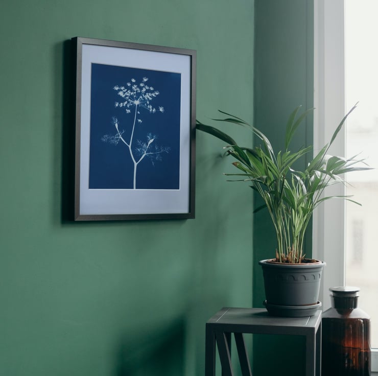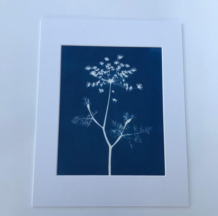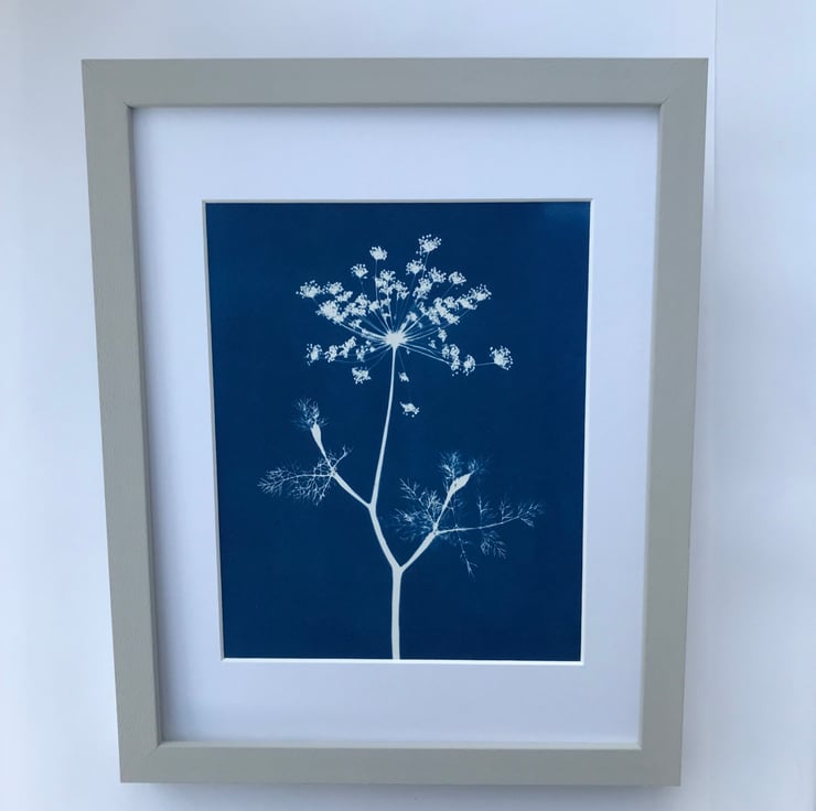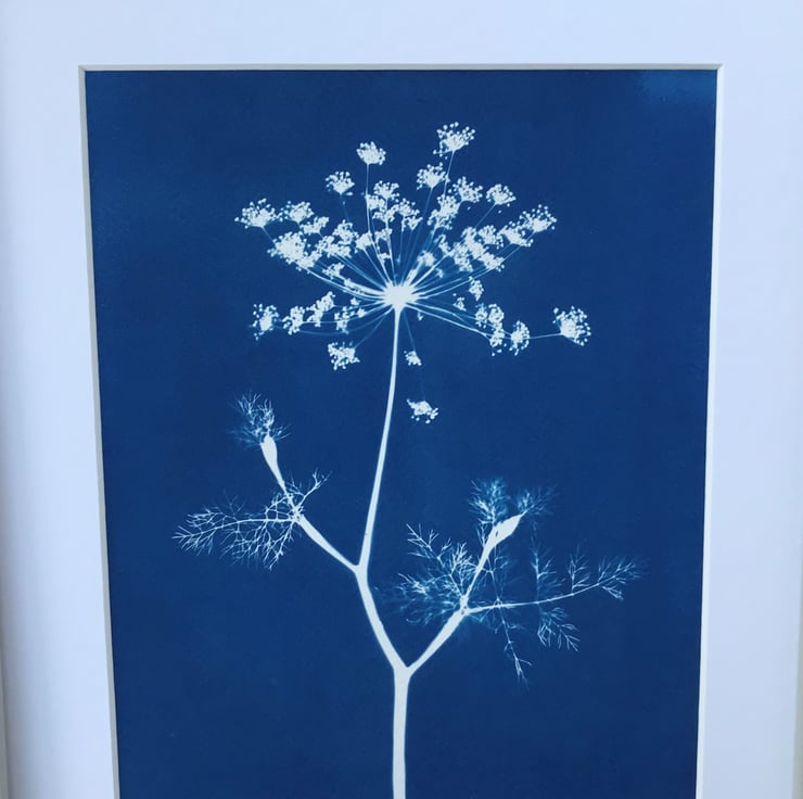 A Traditional Cyanotype Photogram -white Dill flower image on a Prussian Blue background. Simple, stylish, contemporary art, ready for a wall in your -Family room? Home office? Kitchen? Study? Hallway? Guest room? that new extension?