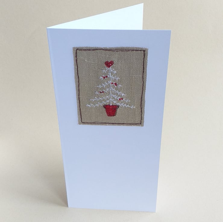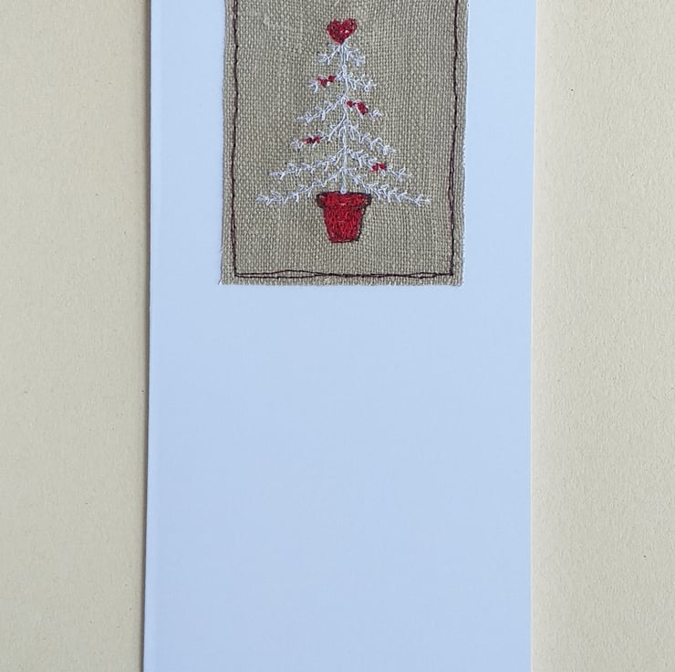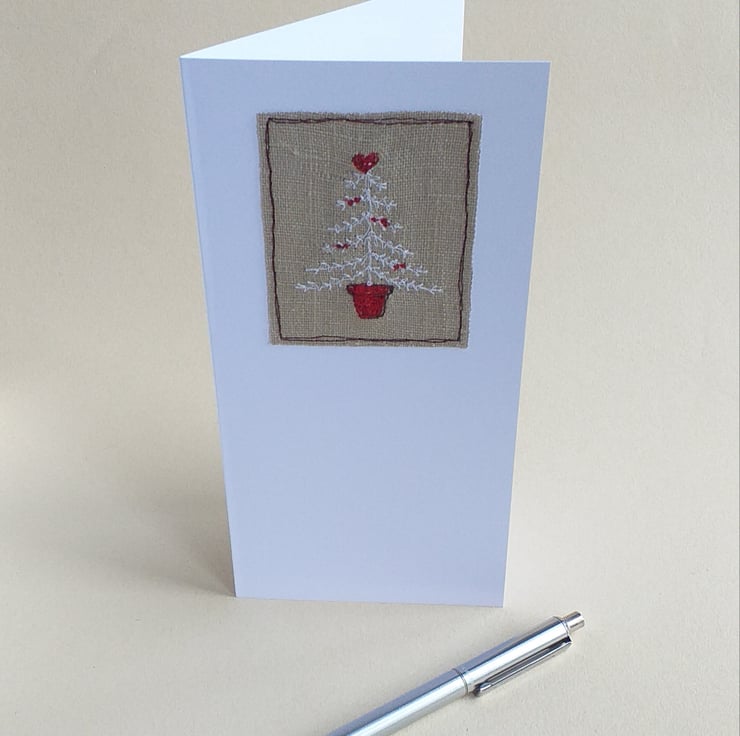 A Scandinavian style Christmas card depicting a white tree in a red pot with a red heart and berries. Embroidered onto linen using freestyle machine embroidery, then sewn straight onto a white card.