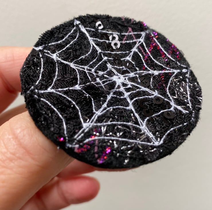 This dramatic handmade free motion embroidered spiders web brooch is made from up-cycled fabrics. It is felt backed, and has a brooch pin with a catch on the reverse to keep it nice and secure. It measures 4.5cm approx.