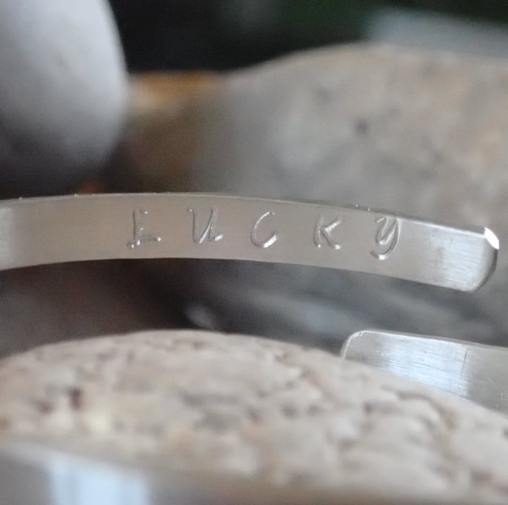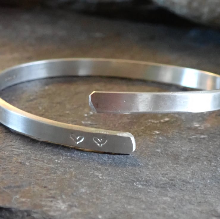 I love the idea of creating a piece of jewellery with a secret message, which only the wearer is aware of. I stamped LUCKY on the inside this silver bangle. It could be given as a good luck present for an interview or an exam, perhaps, or as a general lucky present. The bangle is of a simple design, with two pretty little hearts on the outside.