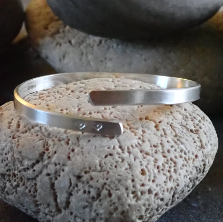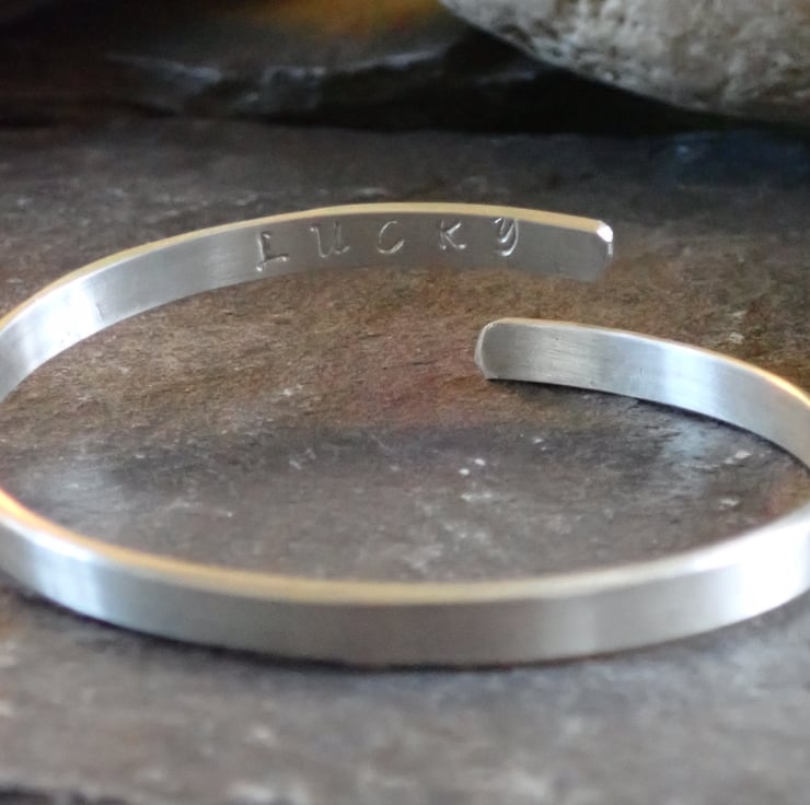 This is a bangle which I have created from recycled sterling silver. I have stamped two cute little hearts on the outside and a secret "LUCKY" message on the inside. It has been hammered into an oval shape, measuring approximately 6.5cm x 6 cm,