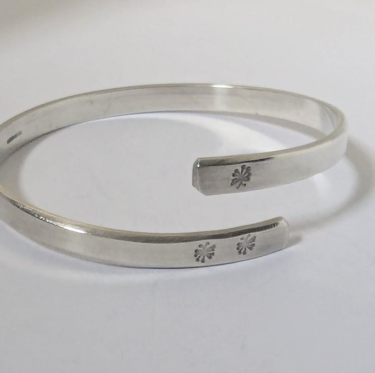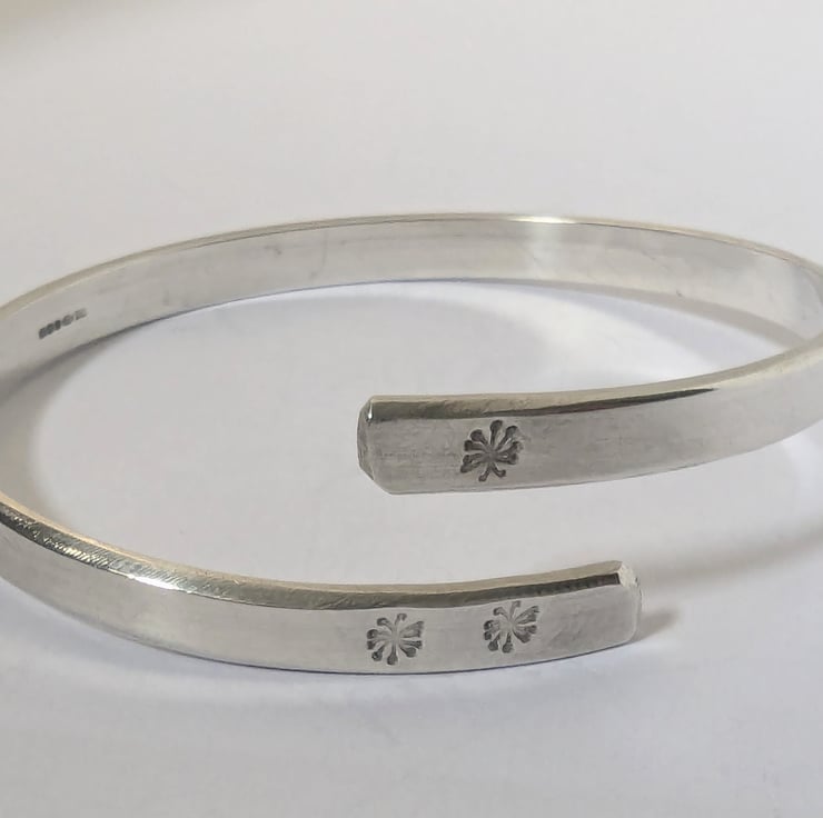 This is a recycled sterling silver bangle which I have stamped with three little dandelion flowers. It has been hammered into an oval shape and measures approximately 6cm x 5.5cm.