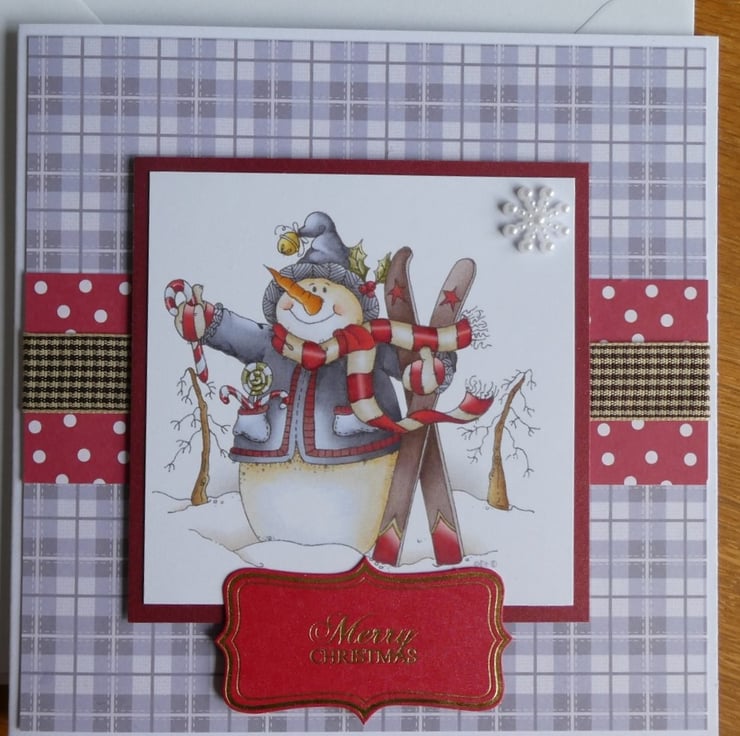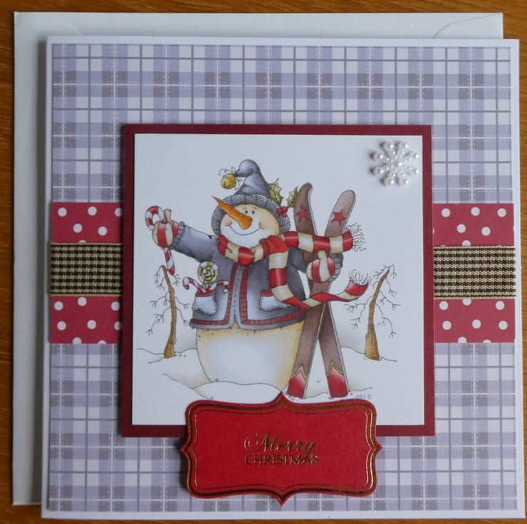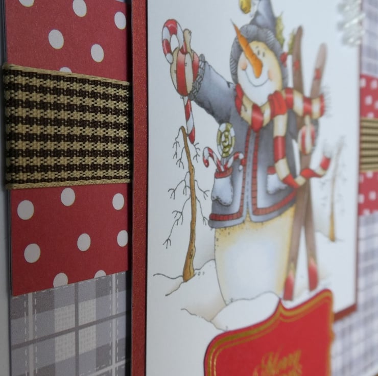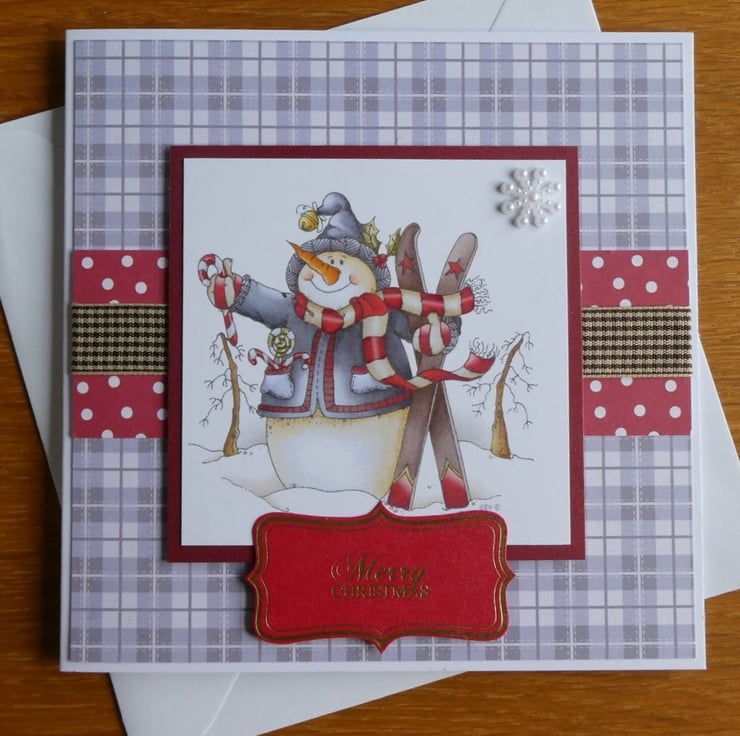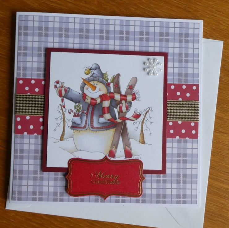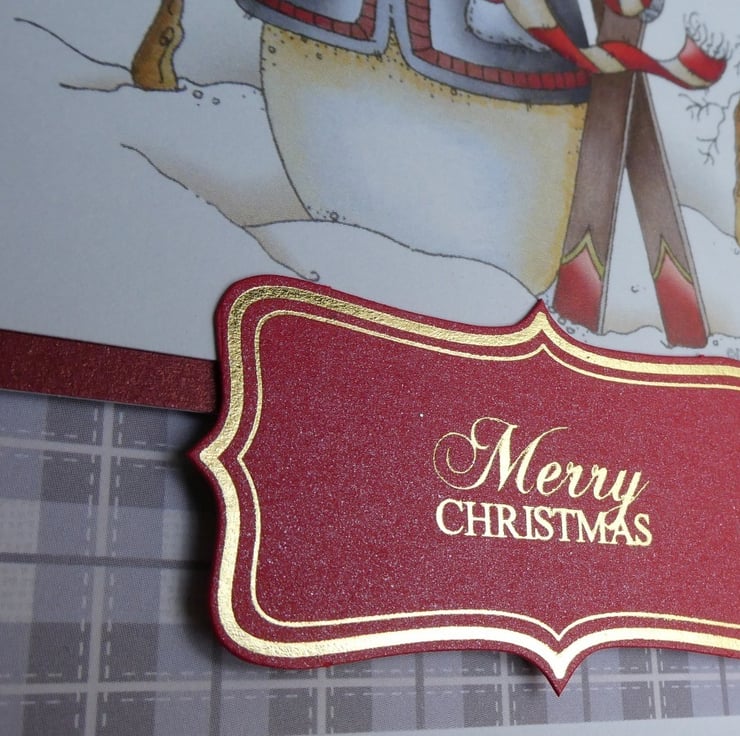 This cute Christmas card has a printed topper showing a snowman wearing a grey jacket and hat and holding a pair of skis.