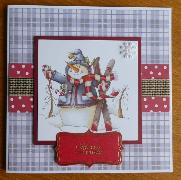 A white snowflake embellishment and a message with the words Merry Christmas in a metallic gold font on a red background have been added to finish the design. Both the image and the message have been raised from the background on foam pads to add interest and dimension.