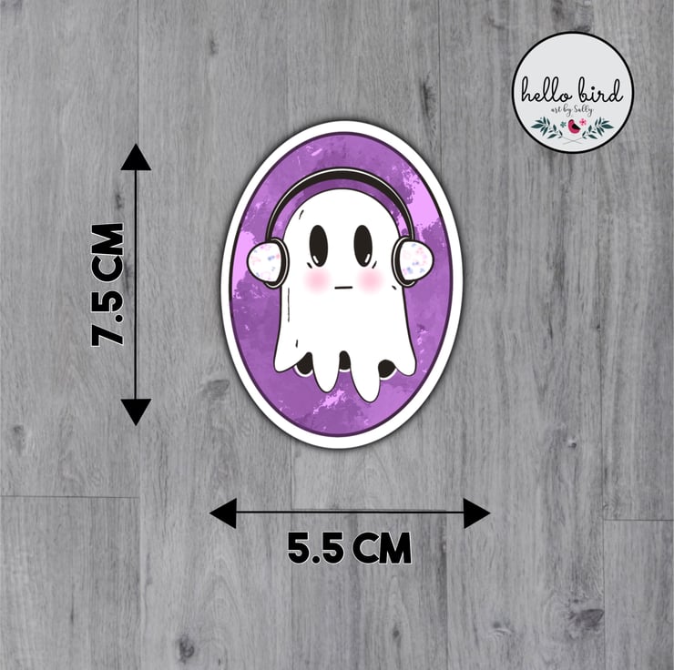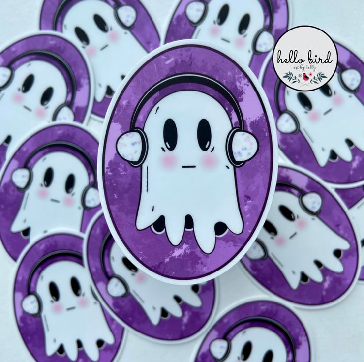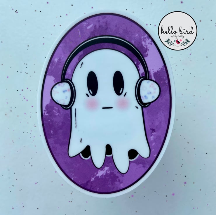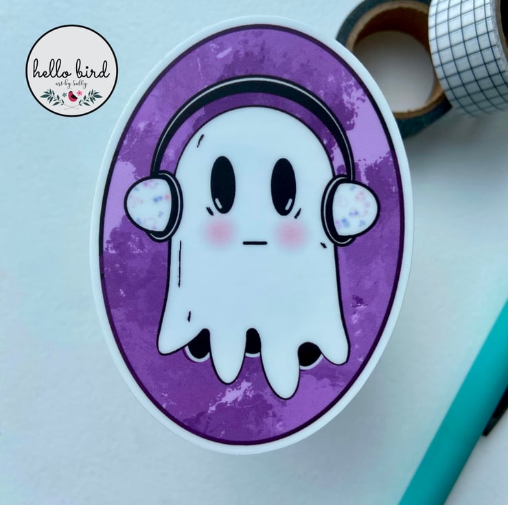 Kawaii style ghost sticker. Original design vinyl sticker featuring a pretty spooky ghost wearing headphones! Digitally hand-drawn by me! Created with crisp, bold colours and lines.