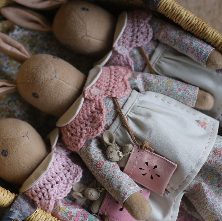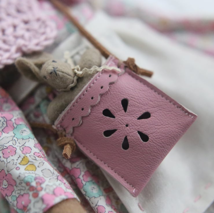 Her accessories include a tiny leather bag, hand punched with a daisy design and containing a baby bunny with a ric rac tie.