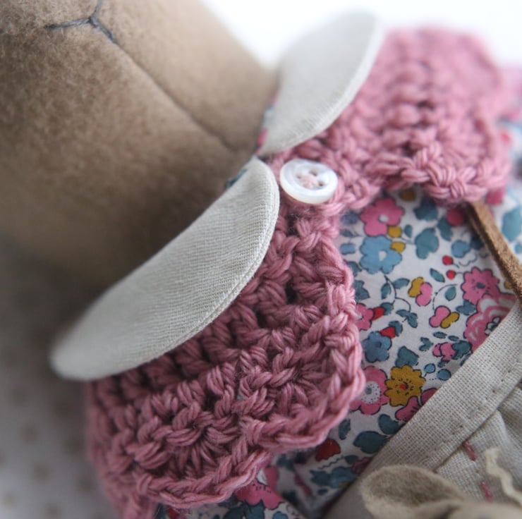 Her cape is crocheted from lovely Rowan yarn and fastened with a vintage button.