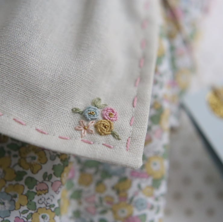 Her apron is made from cotton/linen fabric and embroidered with tiny running stitches.