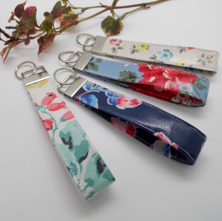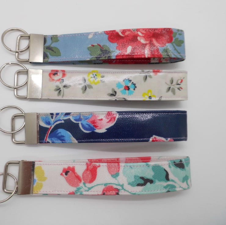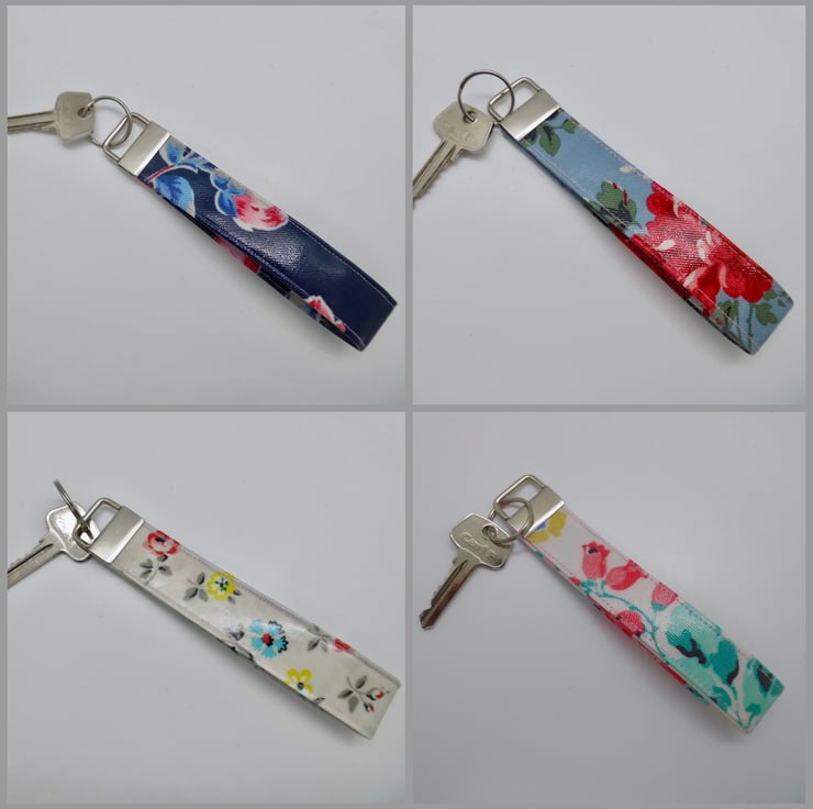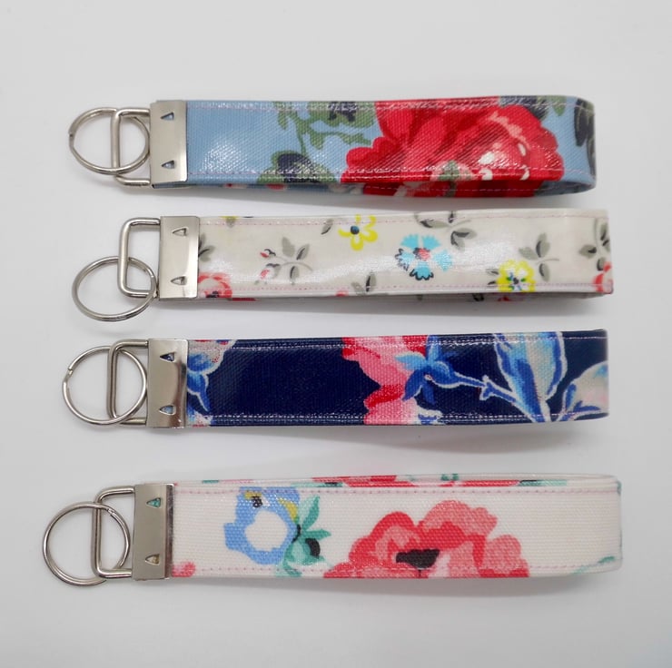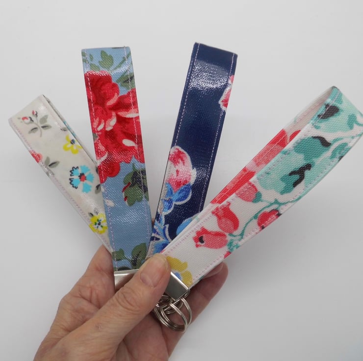 A pack of 4 wrist strap key rings. Made using a selection of Cath Kidston oilcloth fabrics which are strong and wipe-clean as well as very pretty.