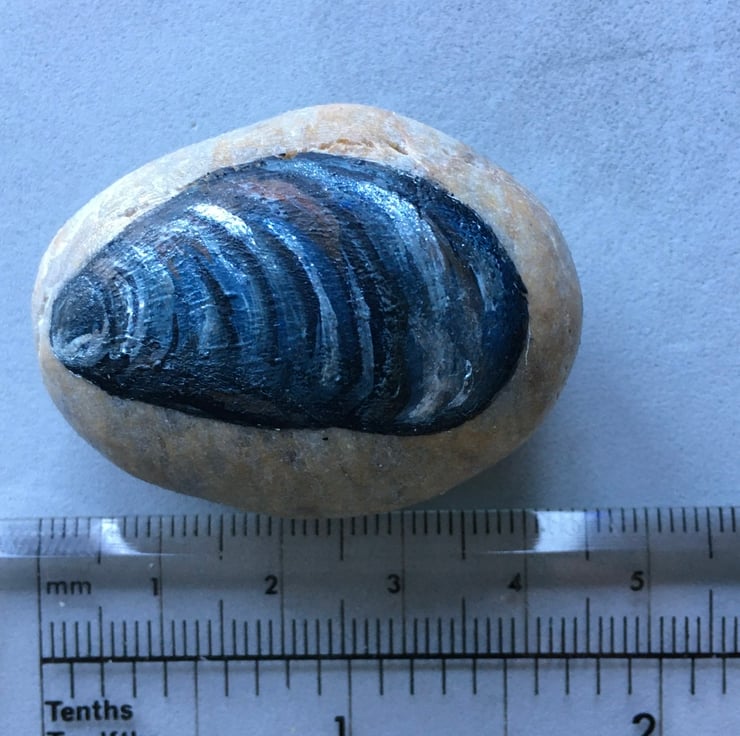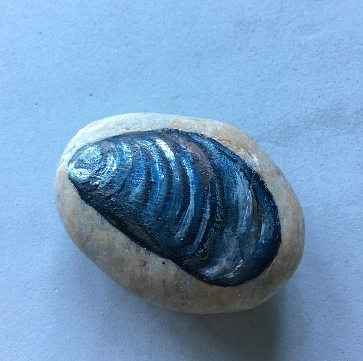 This painted pebble, showing a mussel shell, measures 4.5cms x 3cms approx. It has been painted with acrylic paint and varnished for protection. It will be sent, carefully packaged, postage free to UK destinations.
