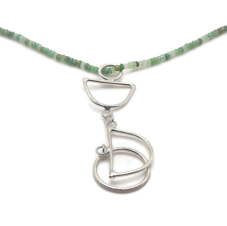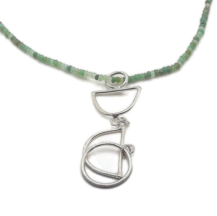 A colourful statement necklace featuring a pendant handmade from sterling silver wire formed into an array of geometric shapes which hangs from a string of faceted natural chrysoprase beads in gorgeous shades of green.