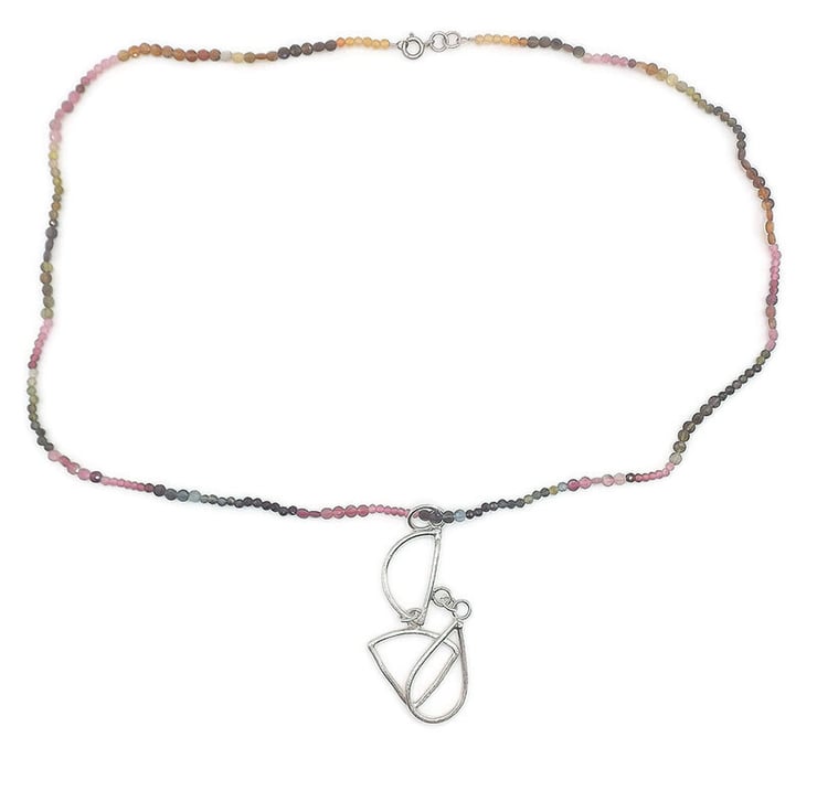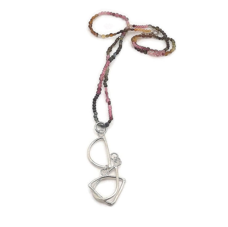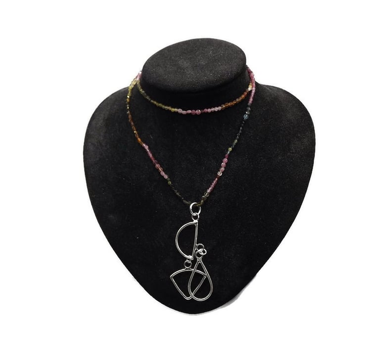 A gorgeous colourful necklace featuring a string of natural tourmaline beads upon which a pendant handmade from sterling silver wire hangs