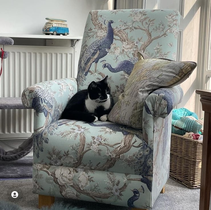 This lovely adult's armchair measures approximately 38 inches in height, by 26 inches wide and will look gorgeous in any room and is a real statement piece of furniture. It has a wooden frame and has a Schedule 3 fire retardant interliner, which makes it compliant with UK fire regulations. It is then upholstered entirely with this quality fabric, and has solid wooden feet.