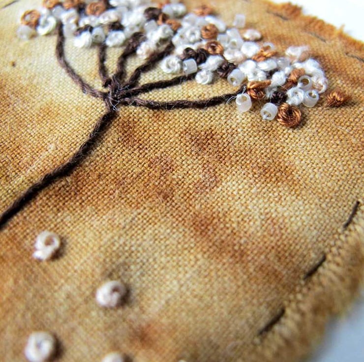 The background fabric for the card has been printed using rusty objects. They are rolled up in the fabric and boiled so the pattern transfers onto the fabric and it is then thoroughly washed and dried before using. These backgrounds are perfect for embroidering onto, and I often draw inspiration for my embroidery from my garden and during my daily walks in the beautiful New Forest.