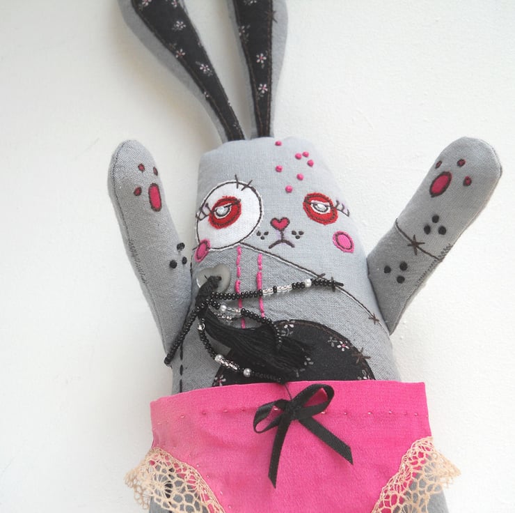 applique, machine & hand embroidered sexy halloween zombie rabbit in pink silk knickers.