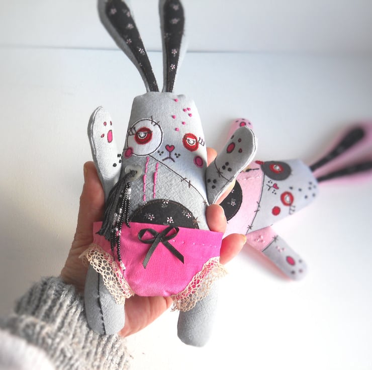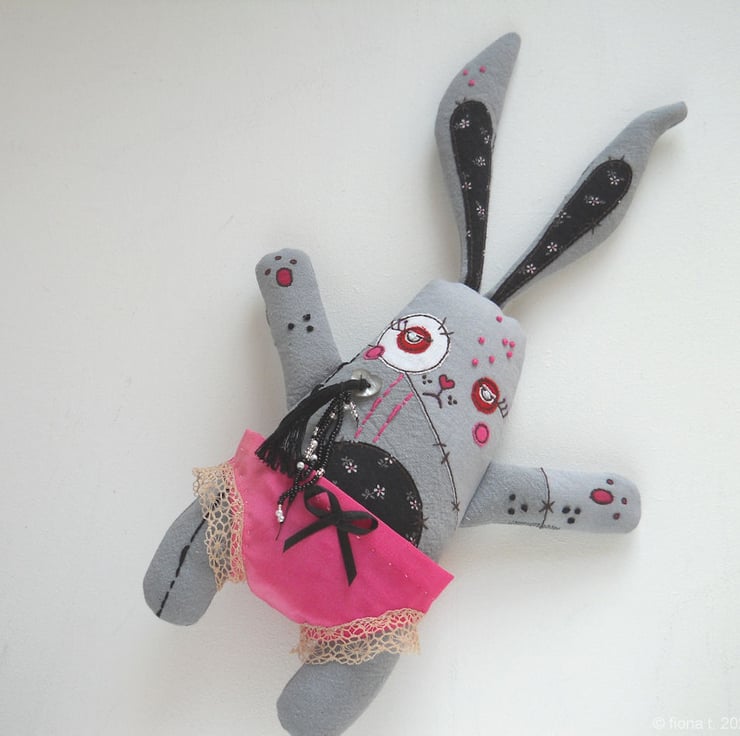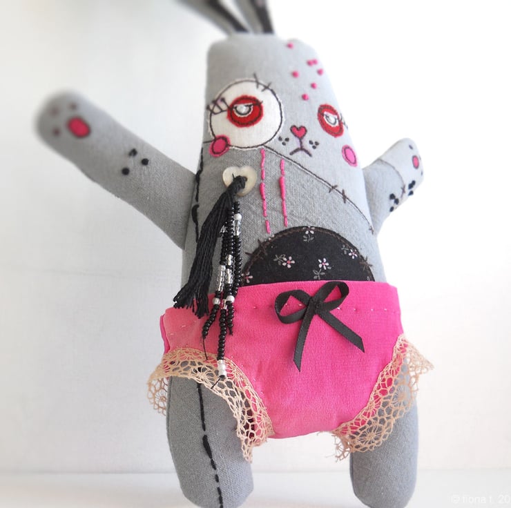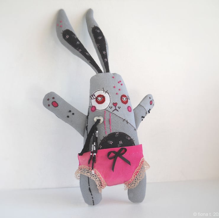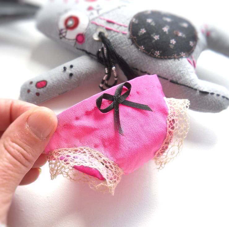hand dyed pink zombie bunny is dressed up all sexy for Halloween, in silk knickers & a beaded nipple tassel. bunny measures 28cm (11inches) from the top of her floppy ears to the tips of her lumpen toes.