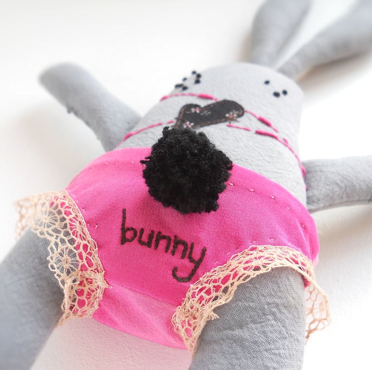 bunny is embroidered front & back, and has an embroidered heart on her bottom.
