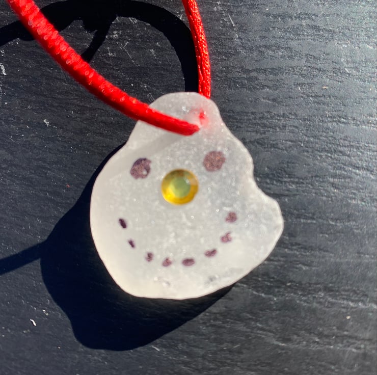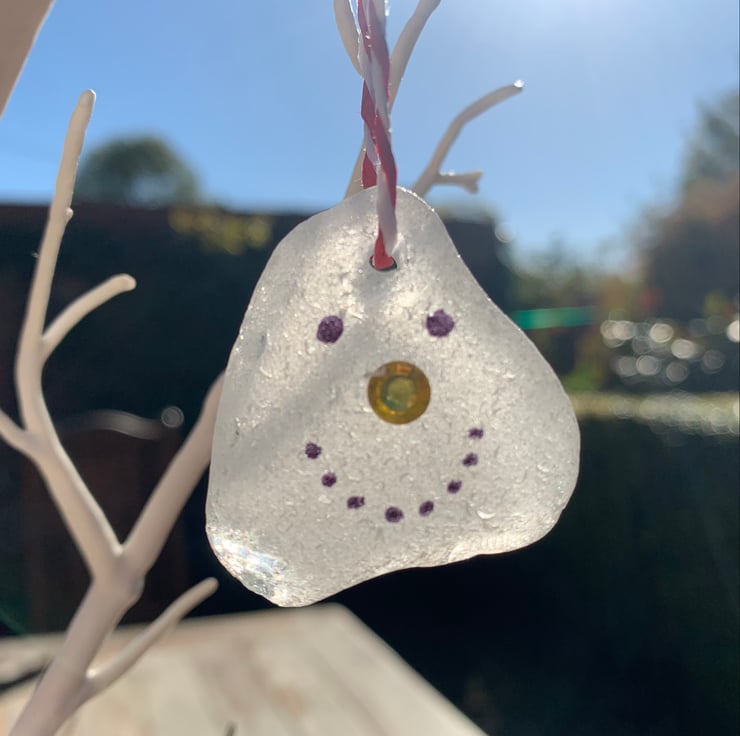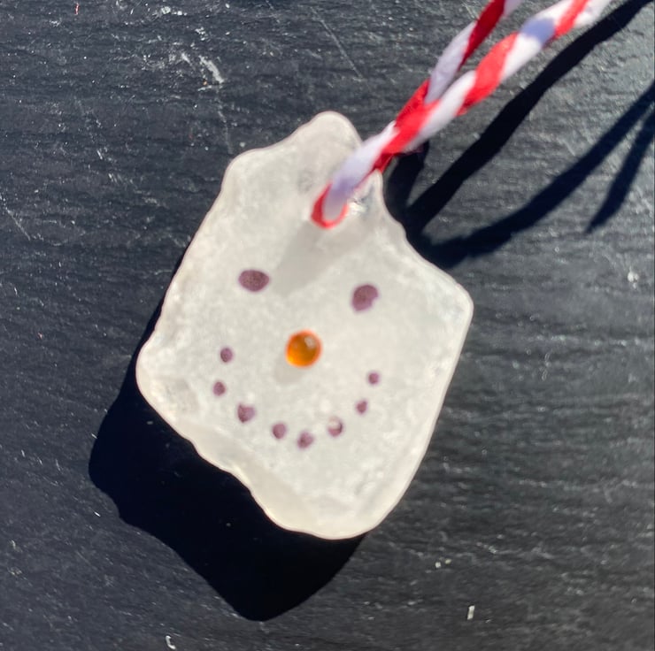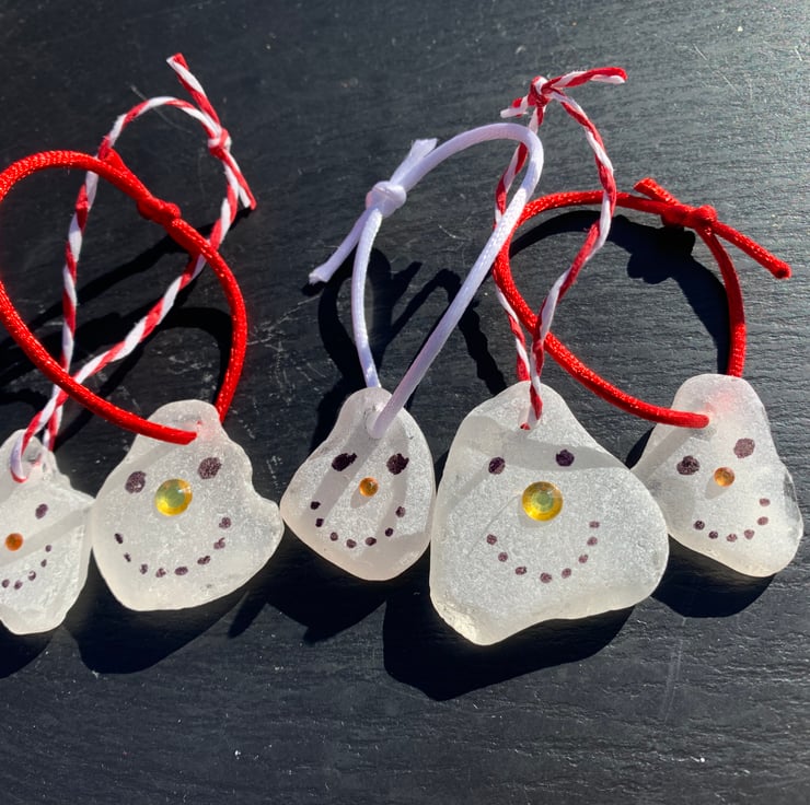 Pieces of white seaglass, collected from Withernsea beach, East Yorkshire, have been drilled to create a hanger, then faces created to make a jolly snowman tree decoration. The seaglass has been washed but not changed in any way so every snowman face looks different. Most are between 2.5 & 4cm in length.