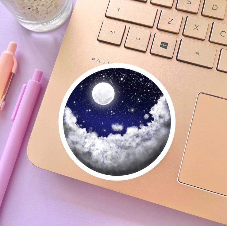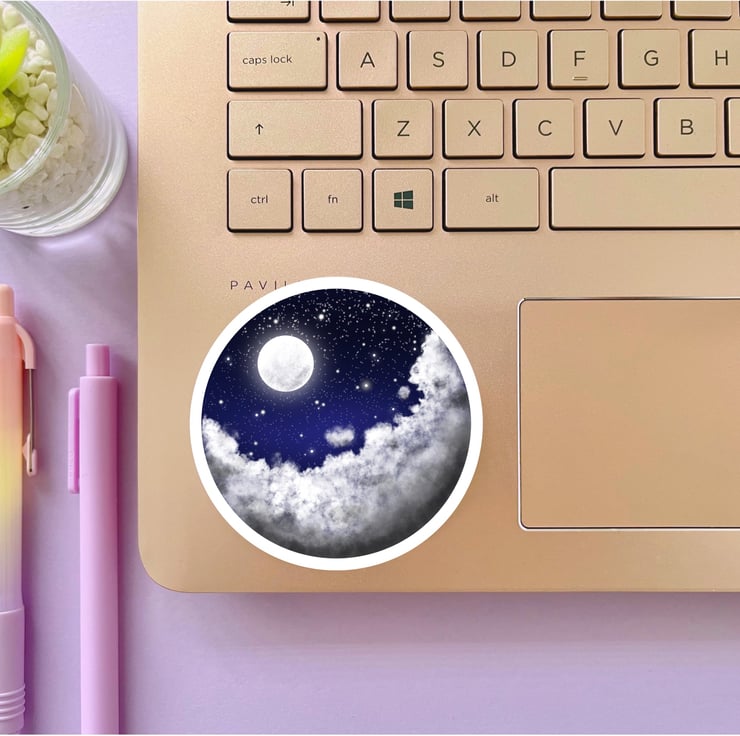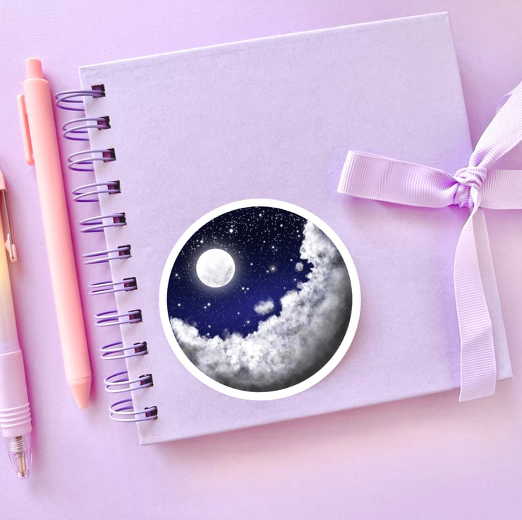 This lovely night sky scene die cut sticker has been hand drawn on the iPad using Procreate. The sticker has then been printed on to 100gsm glossy white photo sticker paper.