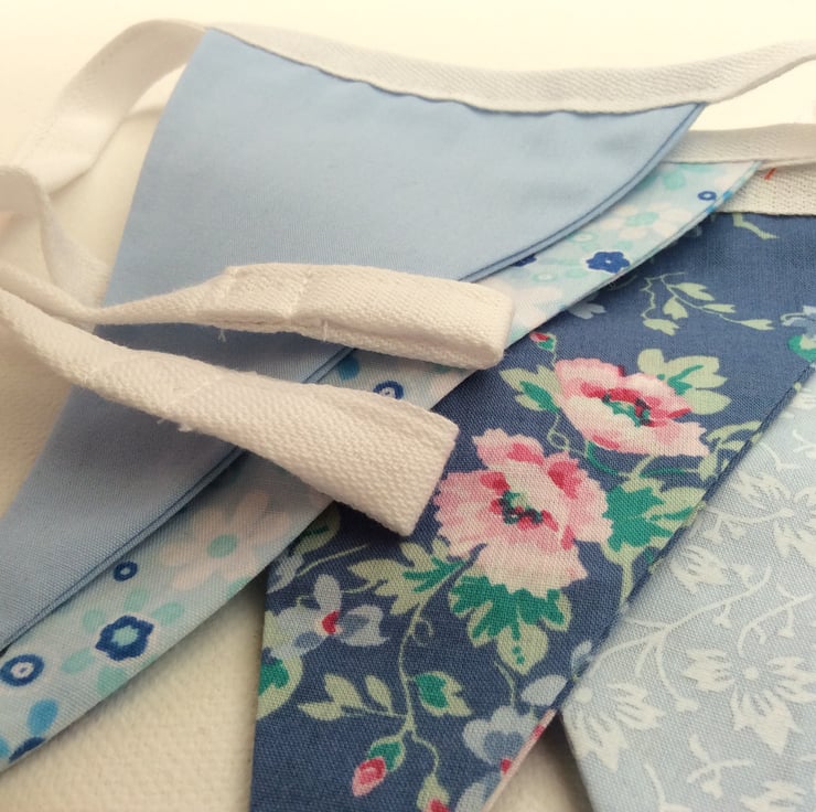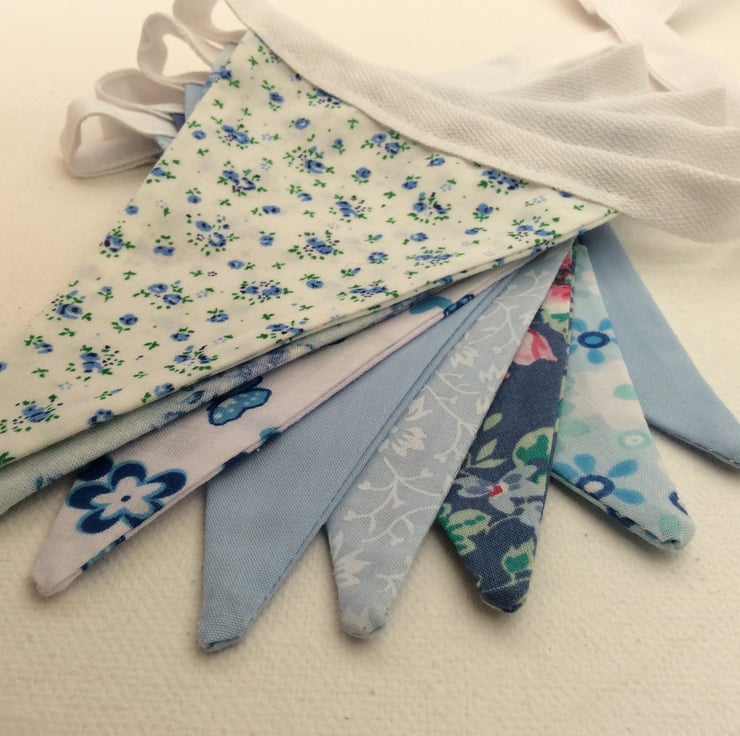There are 8 flags, each one is double sided with the same fabric on both sides. The flags measure 9.5 cm wide x 13 cm long and have been stitched into a length of white cotton tape. Complete with hanging loops at each end