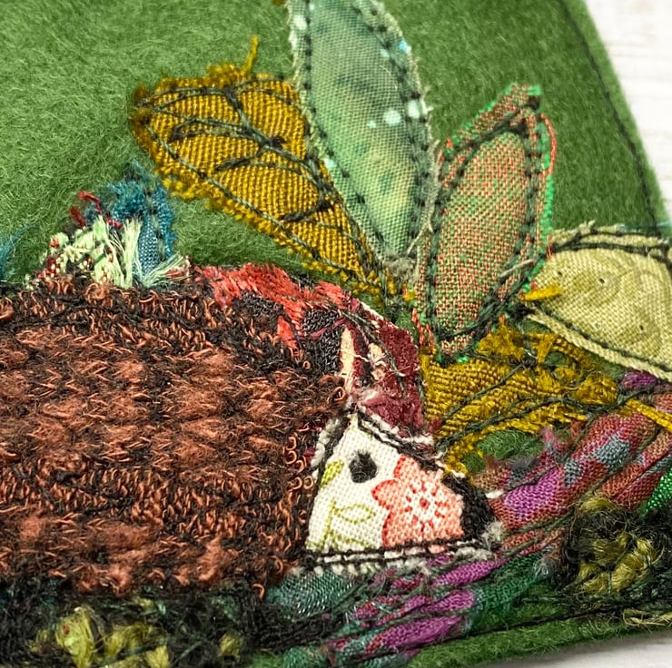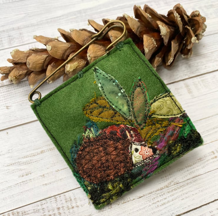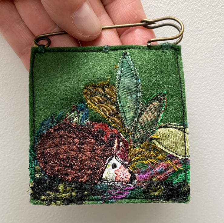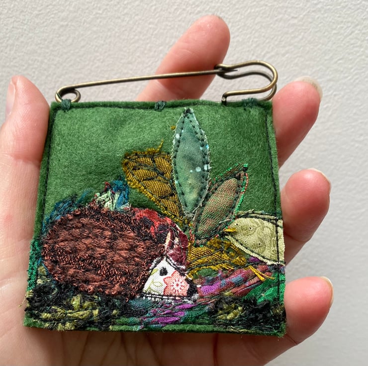 This sweet handmade free motion embroidered hedgehog brooch is made from up-cycled fabrics. It’s stitched onto a kilt pin and is ideal for enhancing all types of clothing or accessories. The brooch measures 7cm square, with the pin it’s 9cm long. The pin is 7.5cm in length.