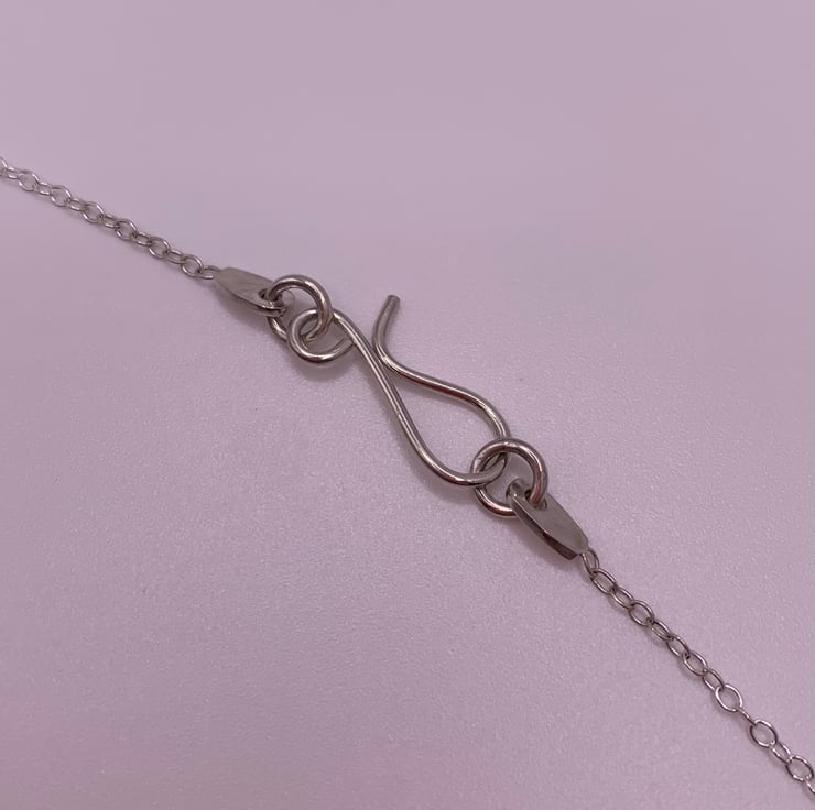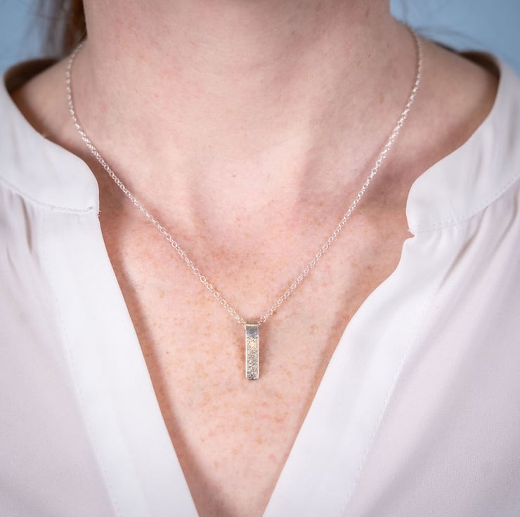 The pendant sits on the collarbone and all parts are made from sterling silver. The pendant measures approximately 4mm wide by 40mm tall.