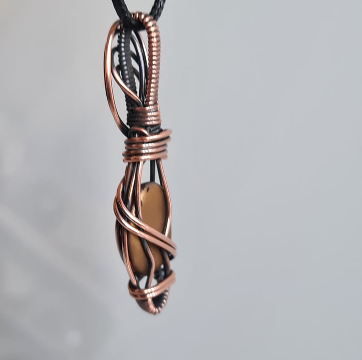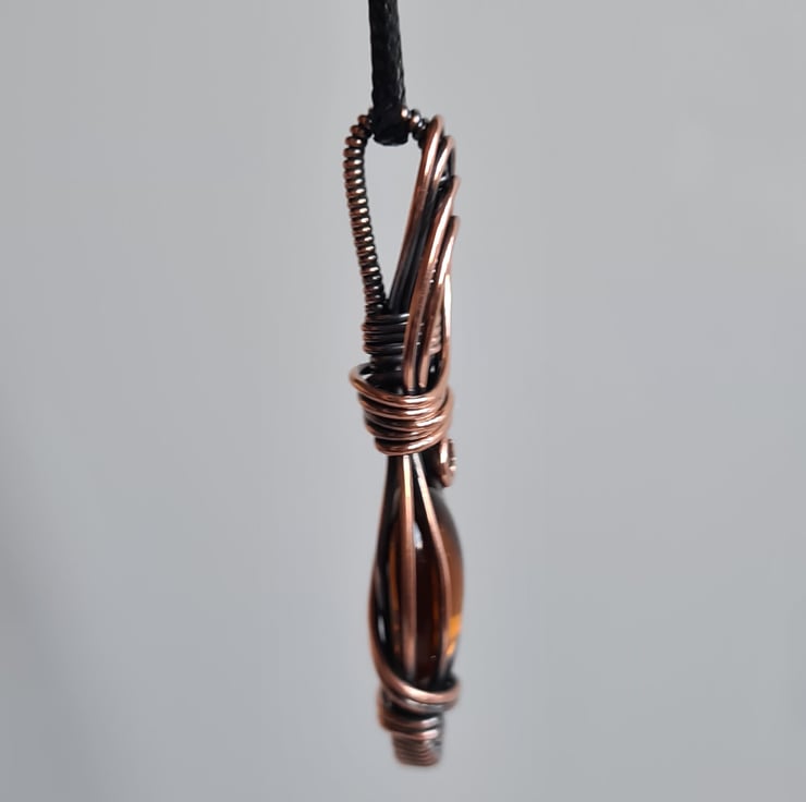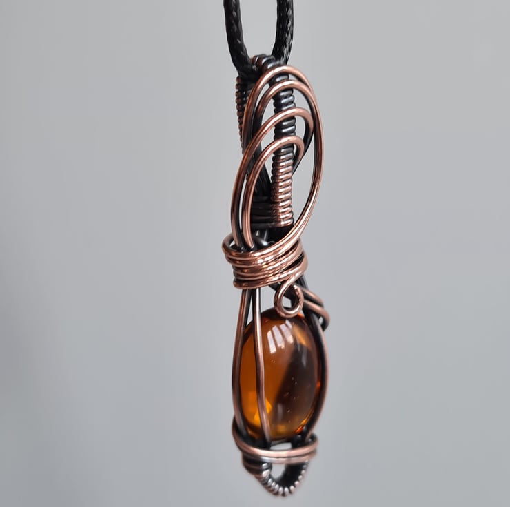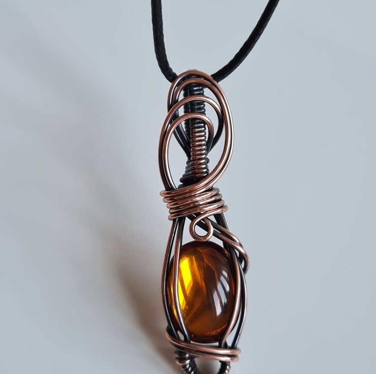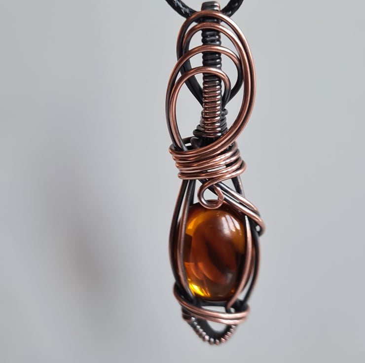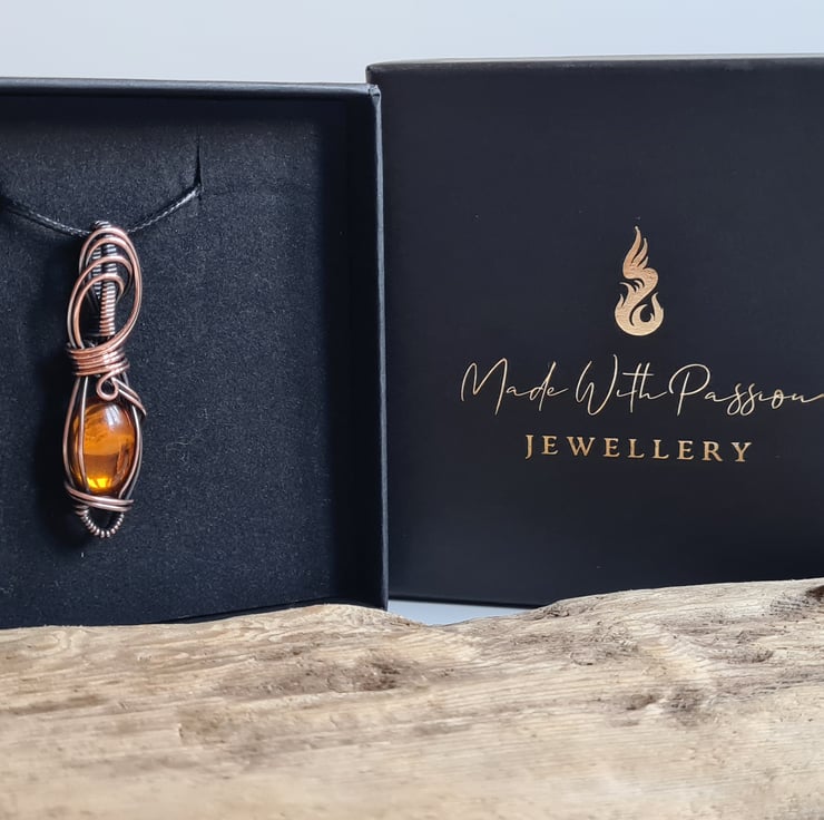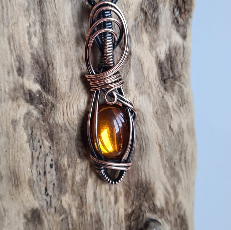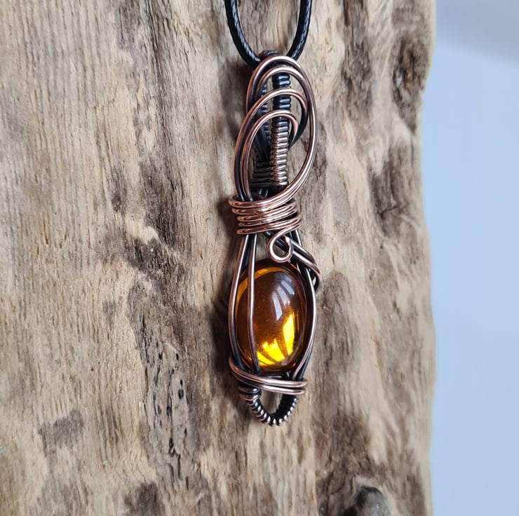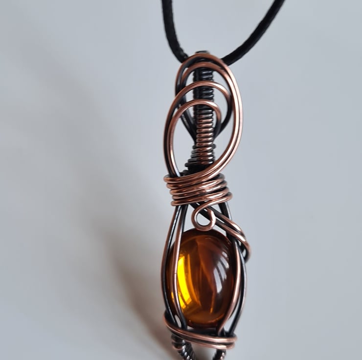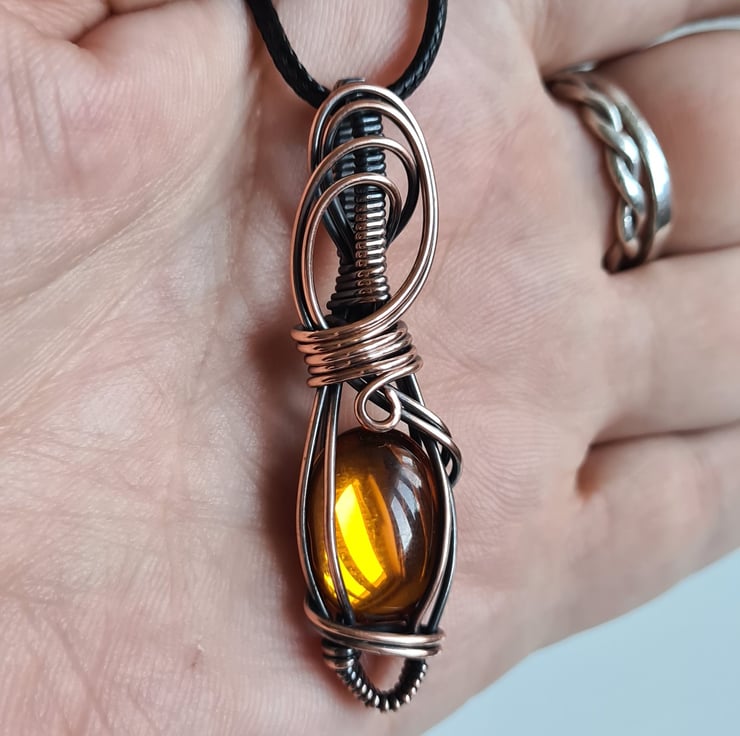 I have taken this gorgeous amber coloured glass cabochon and handwrapped it in raw copper, which I have then antiqued and polished for the final effect.