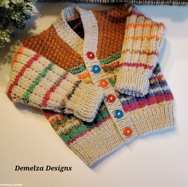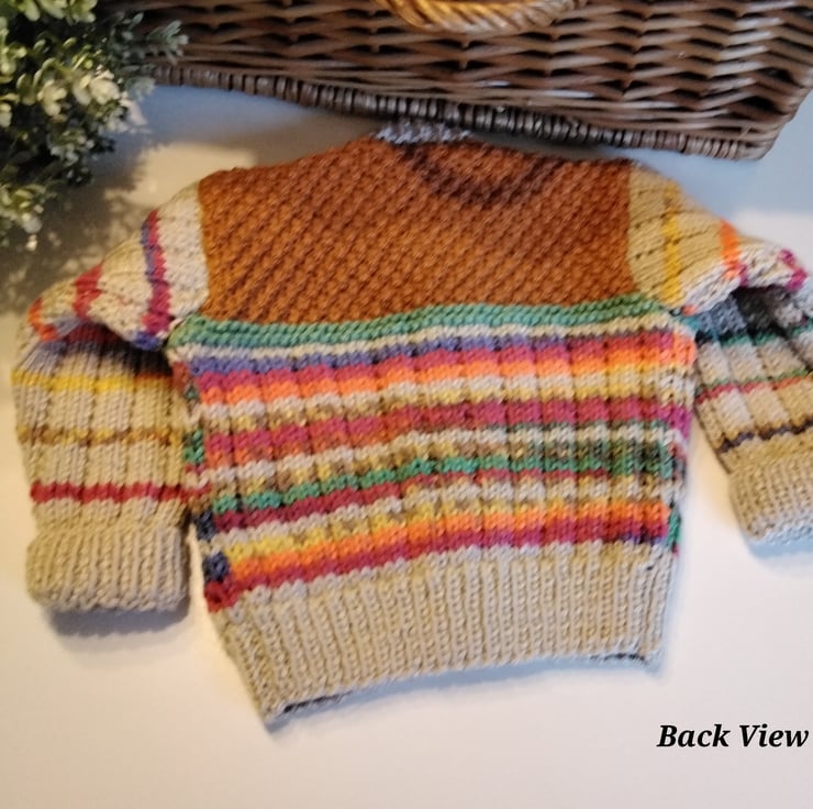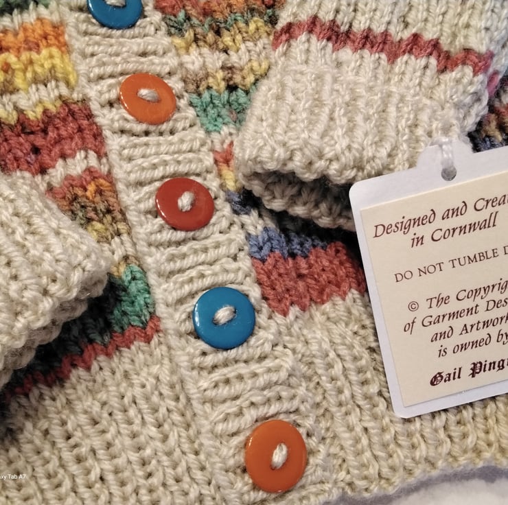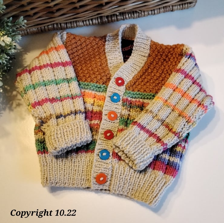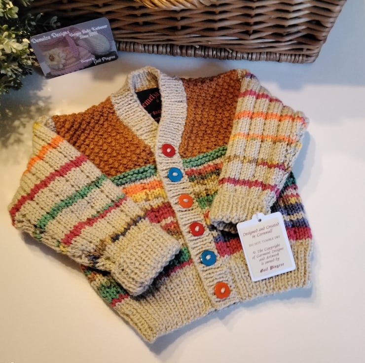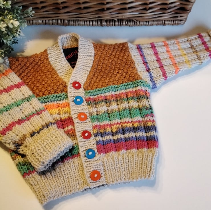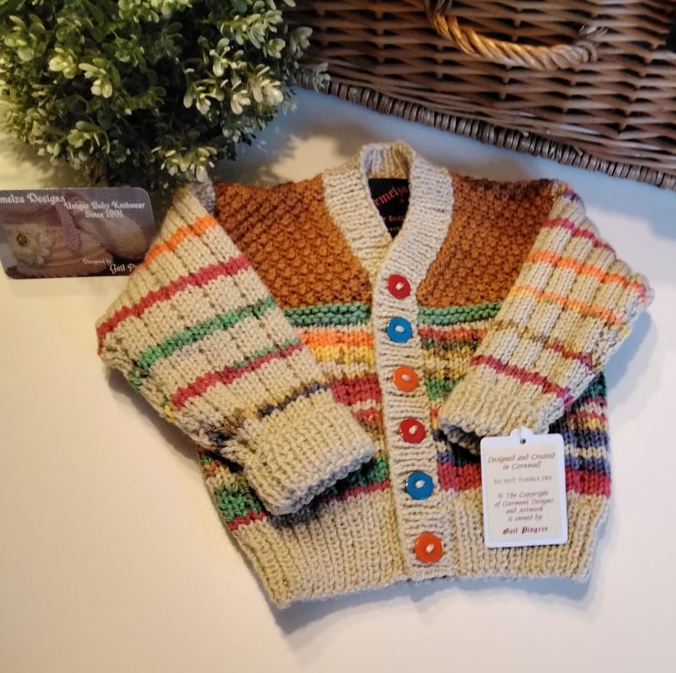A very unique baby cardigan designed and totally hand crafted using quality British manufactured machine washable knitting yarns set at low temperatures settings. The buttons are a mix of three colours to complement the yarn colours. Hand knitted baby wear is also considerably warmer to mass produced machine knitted products.