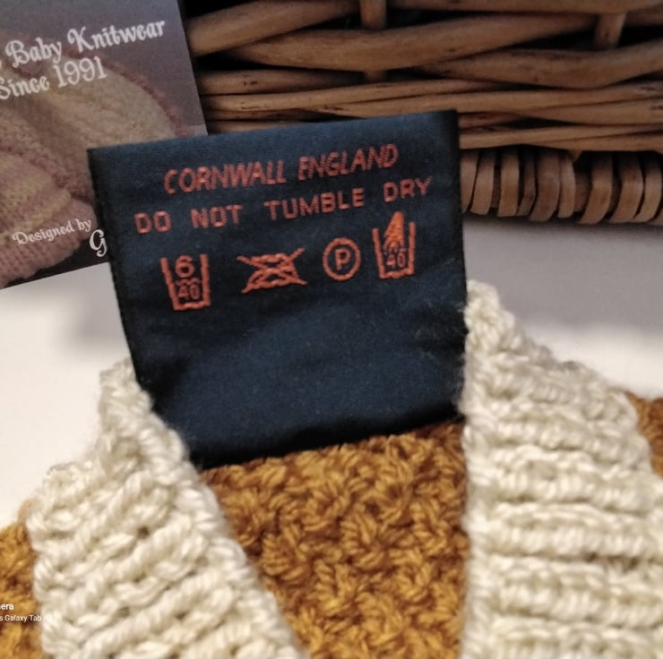 Baby knitwear is designed and hand crafted by Demelza Designs in Cornwall meeting UK baby safety standards, Only branded premuim acylic, acrylic/natural fibre blends or pure natural fibre yarns are used in baby knitwear which conforms to BS984/76 standards.