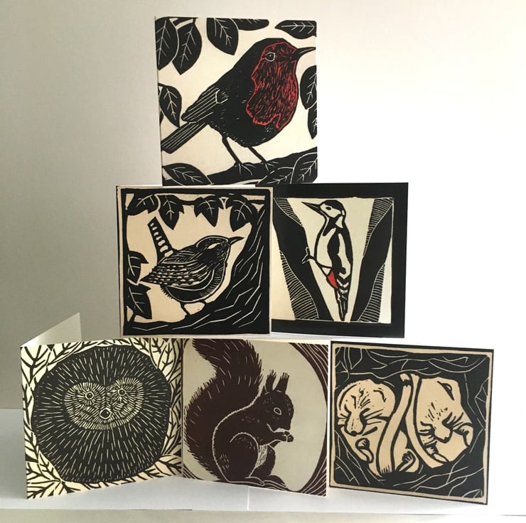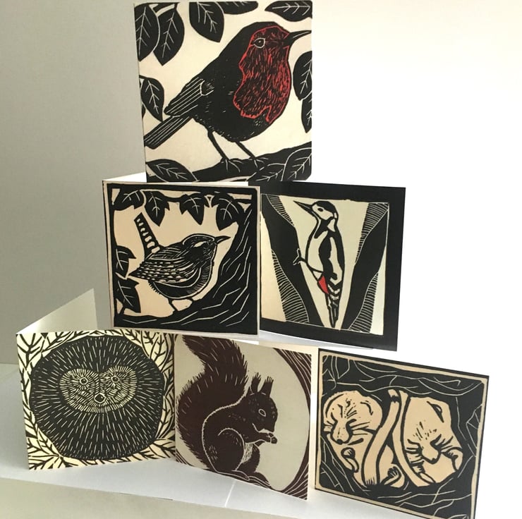 This listing is for sets of four or six of my animal and birds greetings cards. These cards feature my six original linocut designs - "Wren", "Woodpecker", "Robin", "Dormice", "Hedgehog" and "Red Squirrel".