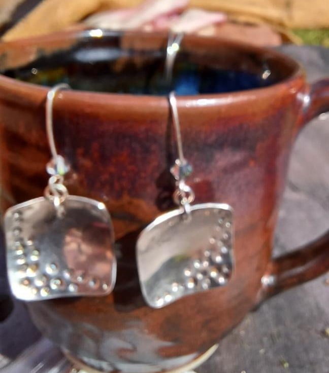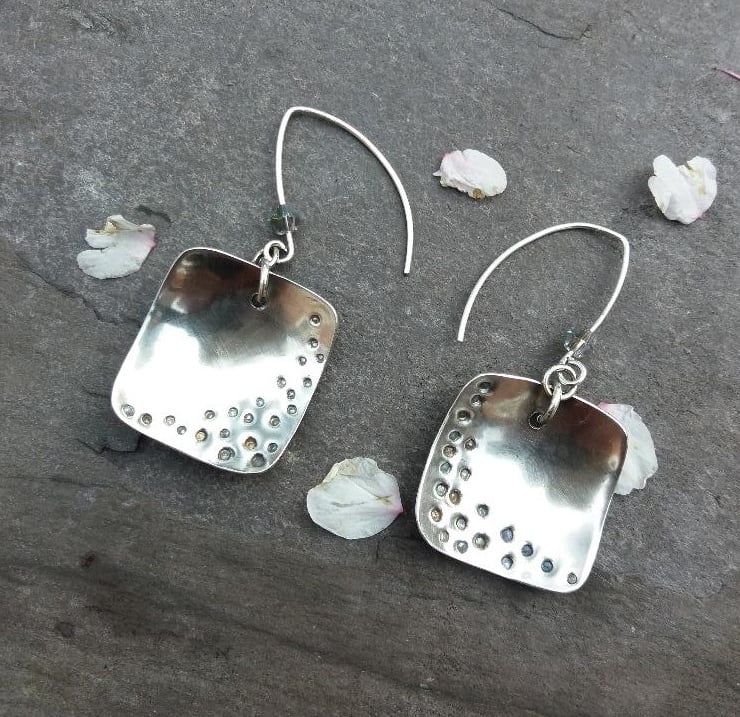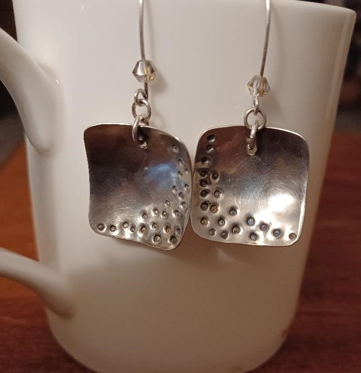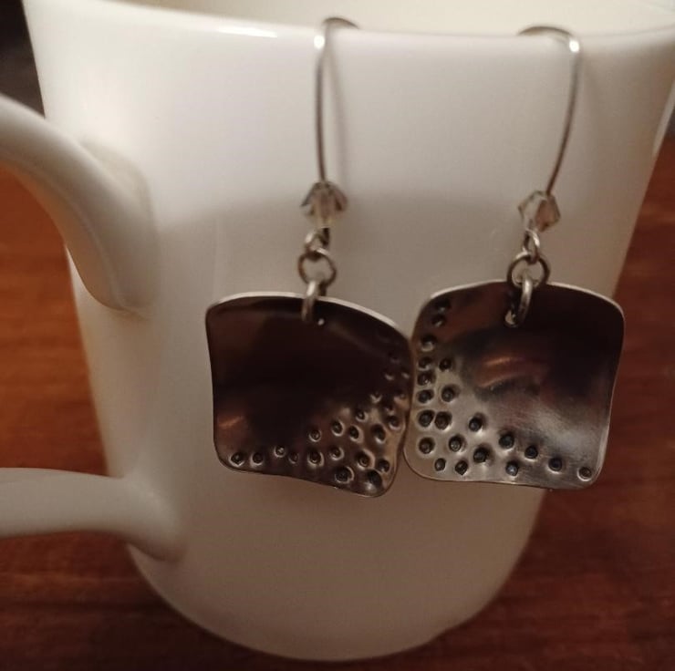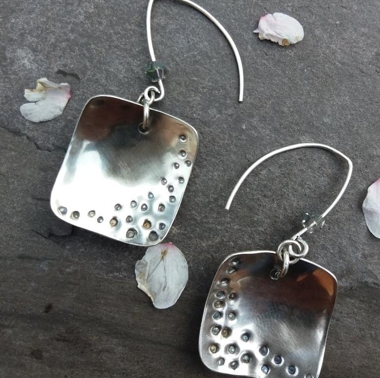 Stylish sterling silver squares, domed and patterned with "holes", hang from handmade earwires. The silver squares are 2cm in length and width. The total length from the top of the earwires is 5cm. Each earring has an added sparkle from a grey swarovski crystal.