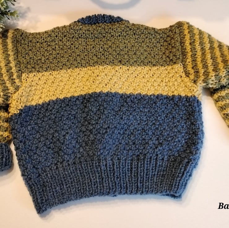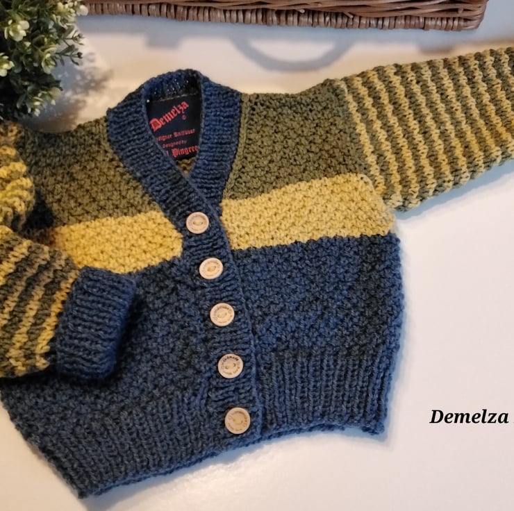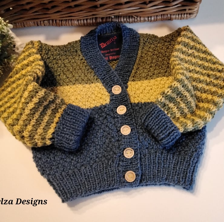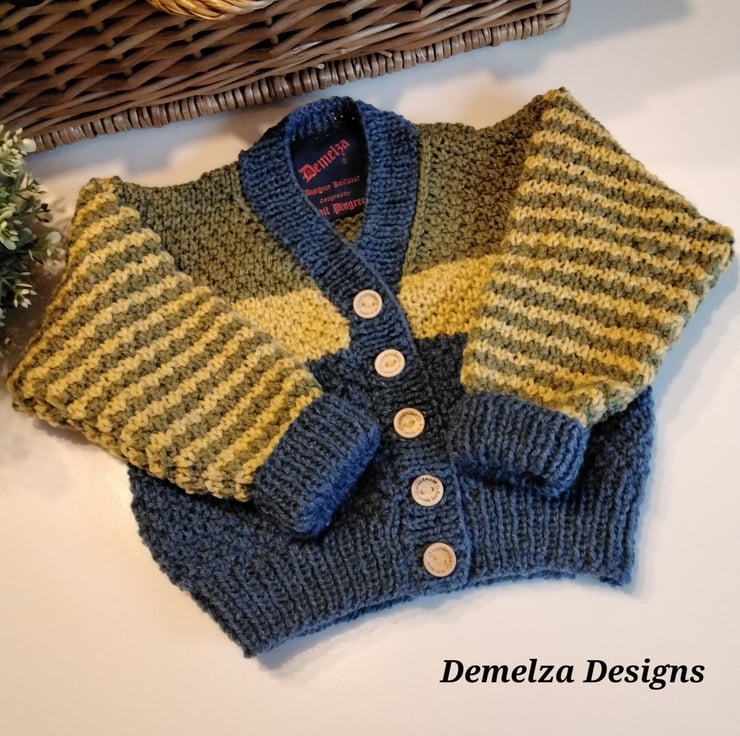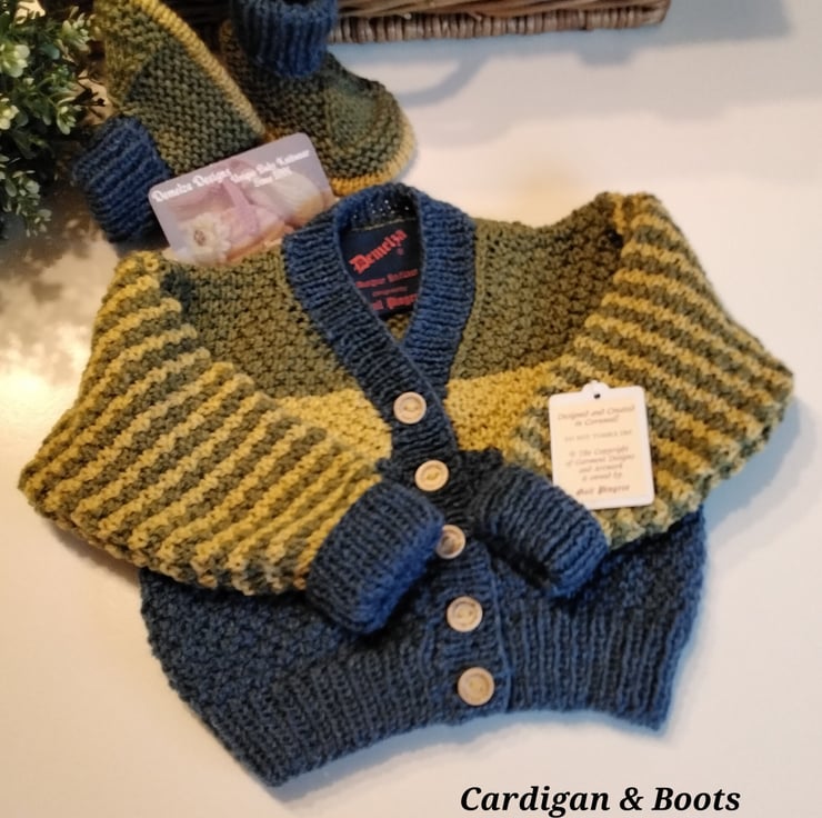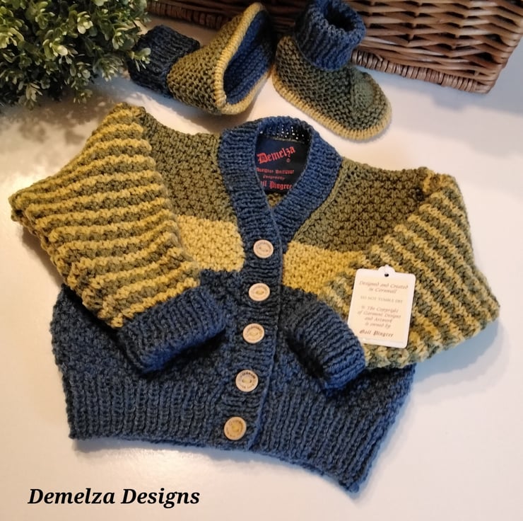 A practical cosy warm baby cardigan and matching booties gift set designed and totally hand crafted in Cornwall using quality premium branded acrylic British manufactured yarn. The items are machine washable at low temperature settings.