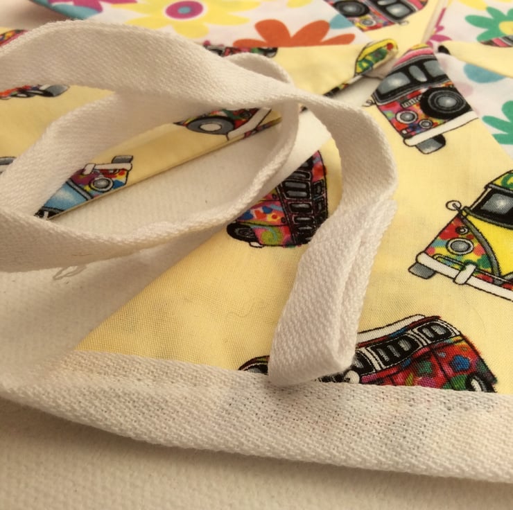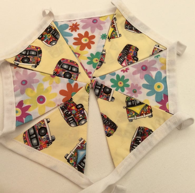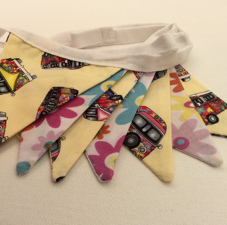 Each flag is double sided and has been stitched into a white cotton tape with hanging loops at each end, fabrics are 100% cotton for the campervan and polycotton for the retro floral fabric.