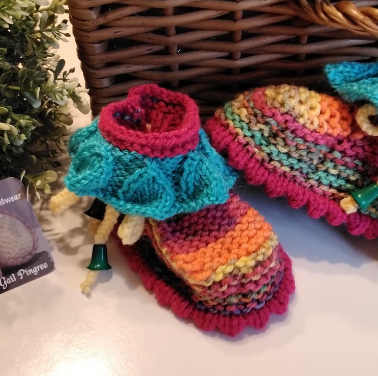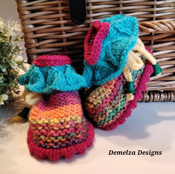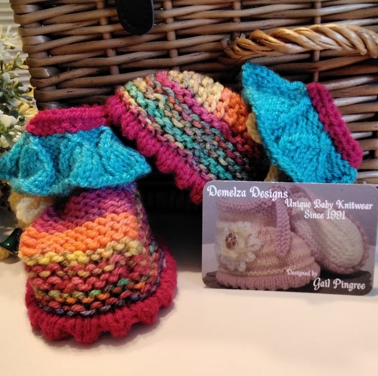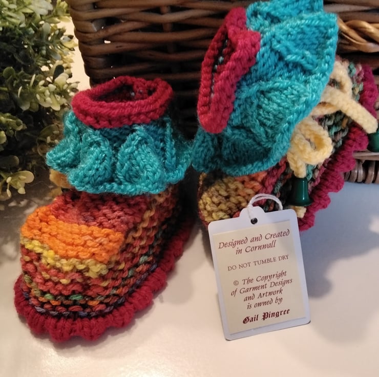 A very sweet eye catching pair of baby girl's winter frilly stroller booties designed and hand crafted using quality branded British and French machine washable acrylic yarns. On each bootieis a draw string with green tassle ends for a unique look and professional finish. At the top are frills knitted within the actual bootie as apposed to knitted and attaching separately. Hand knitted baby knitwear is considerably warmer than mass produced products due to the nature of hand knitting as air is trapped within each stitch forming warm air pockets.