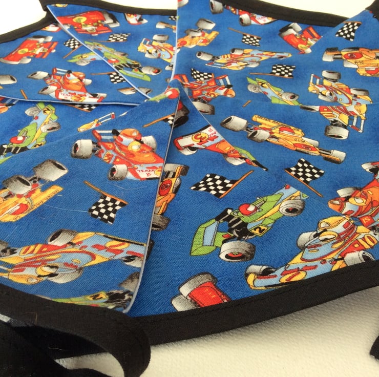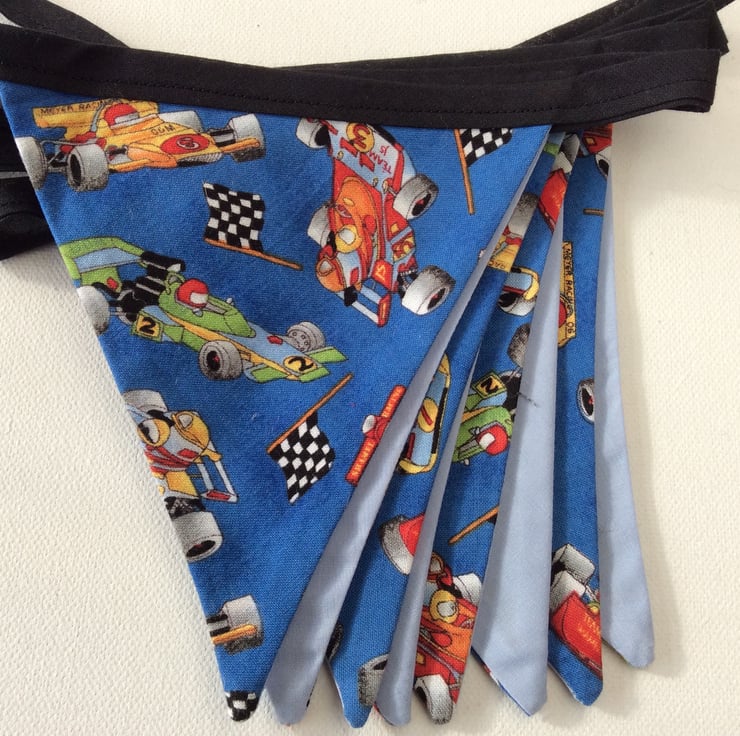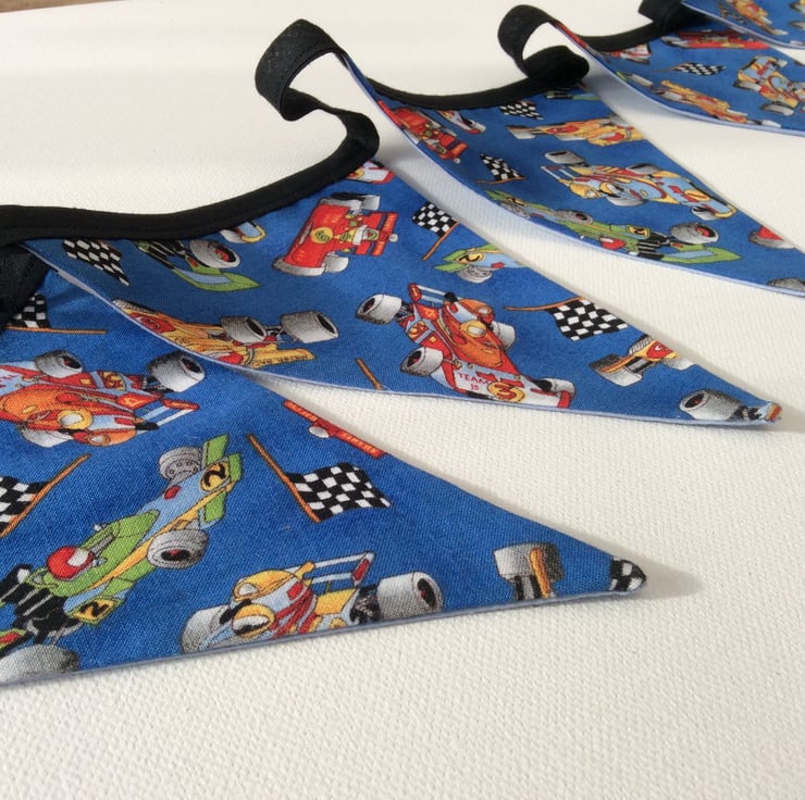 Race car Bunting, featuring multi-coloured racing cars & chequered flags.