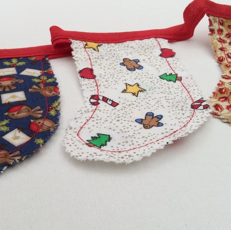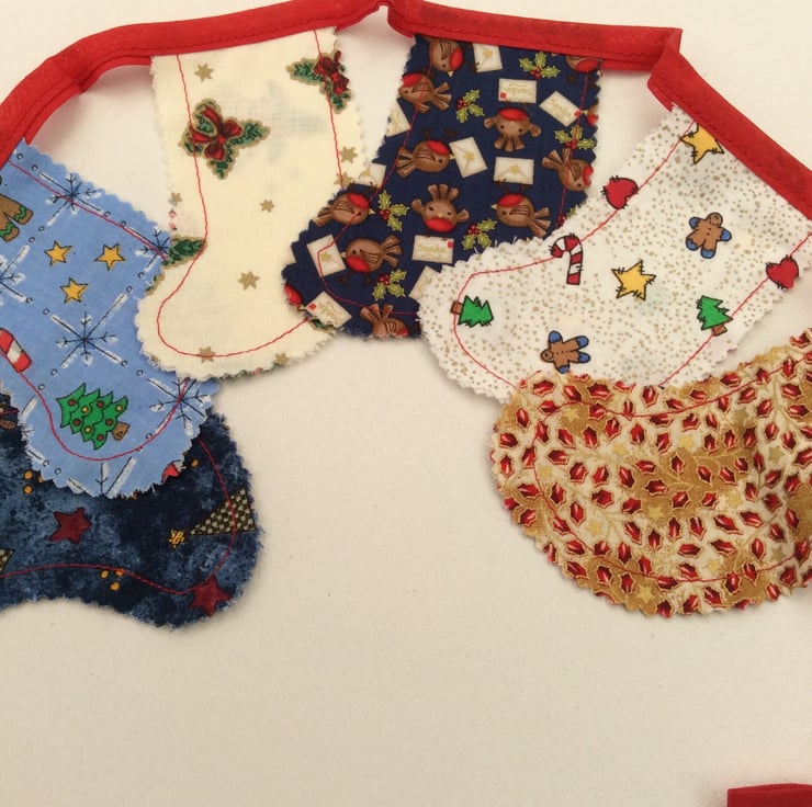 Mini Stocking Garland hand made using Christmas print fabrics. Six stocking shapes on this run of bunting, each double sided with contrast stitching along a zig zagged edge and stitched into a length of red binding which has hanging loops at each end.